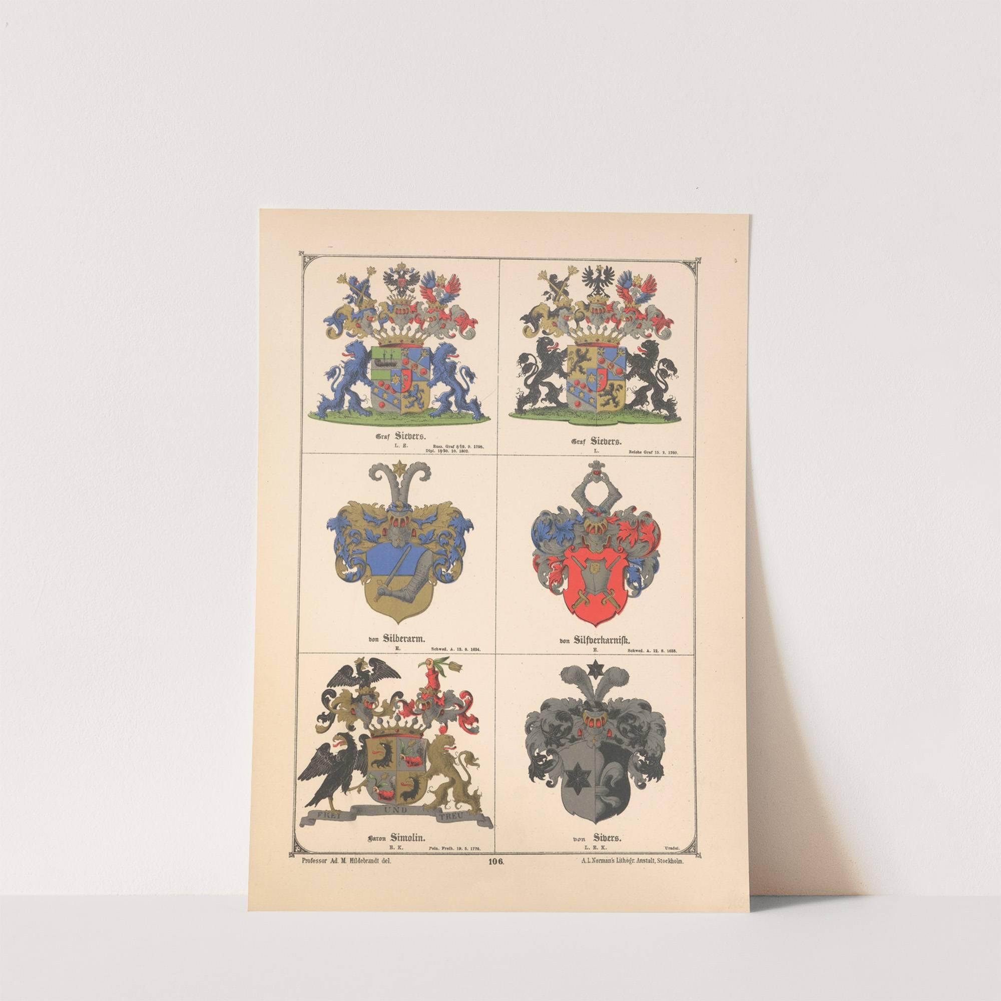 Introducing "Baltische Wappenbuch Pl.096" by Adolf Matthias Hildebrandt – a vibrant collection of six meticulously illustrated coats of arms. Each coat showcases an intricate array of colorful heraldic elements, expertly arranged in distinct, separate quadrants.The top left quadrant features a...