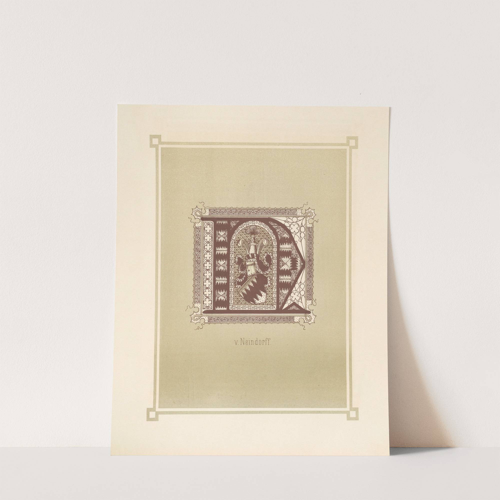 This art print features "Heraldisches Alphabet Pl.14 (1884)" by Adolf Matthias Hildebrandt, showcasing an intricate and vintage design with rich, warm tones. The centerpiece is a detailed, ornate letter "D" encased in an elaborate frame that includes geometric patterns and...