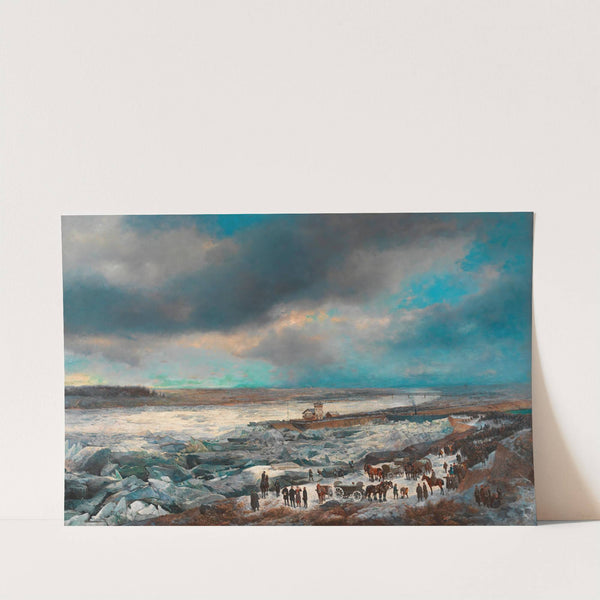 Experience the breathtaking beauty of winter landscapes with this stunning art print by Alexander Bensa, titled "Der Donaueisstoß im Jänner 1880 mit dem Sperrschiff." This vivid painting captures a serene winter scene featuring a group of horses and their handlers...
