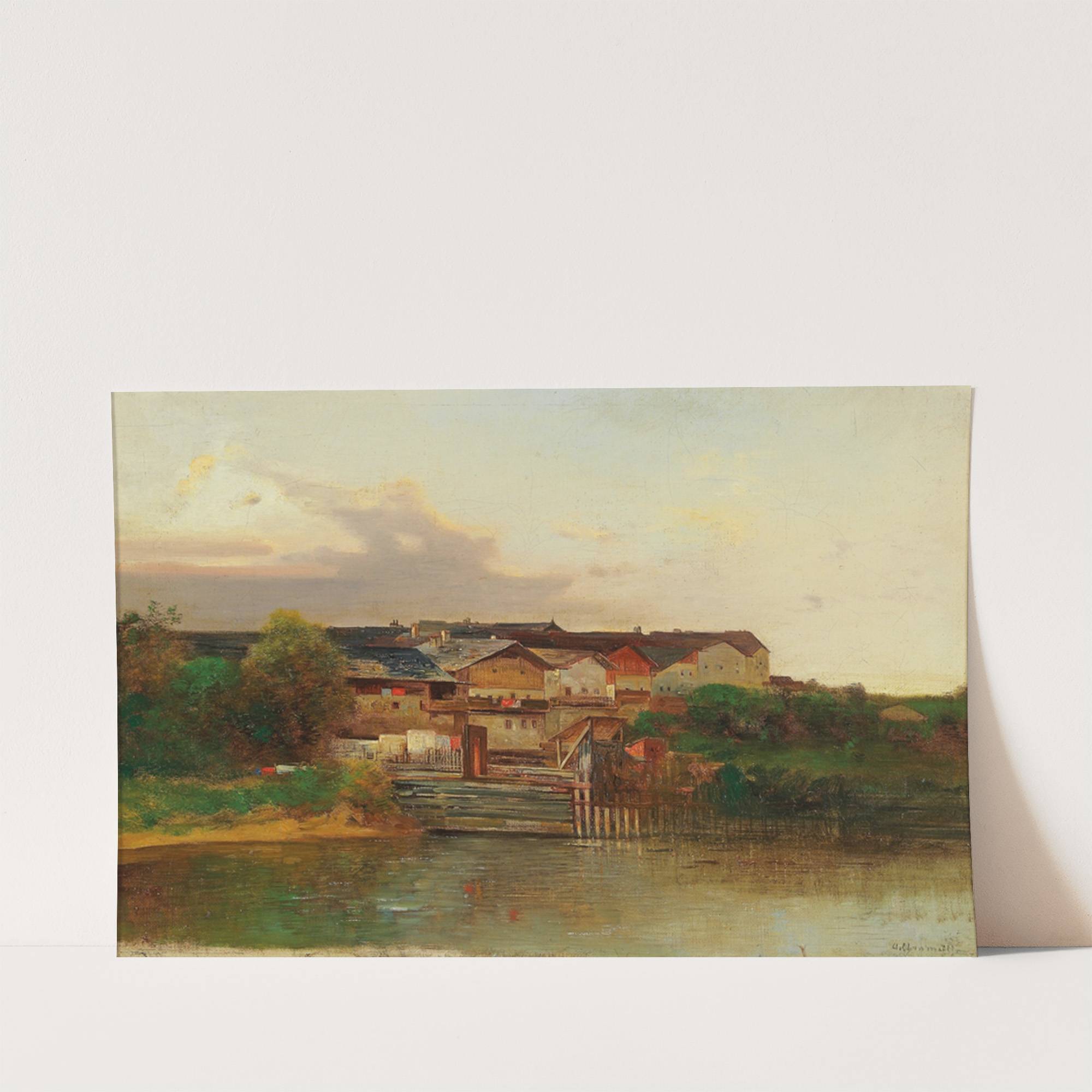 This captivating art print features "Wehr am Fluss" by Adolf Obermüller, showcasing a tranquil village scene along a river. The artist masterfully uses oil on canvas to depict the idyllic landscape bathed in warm, golden sunlight. The foreground is dominated...