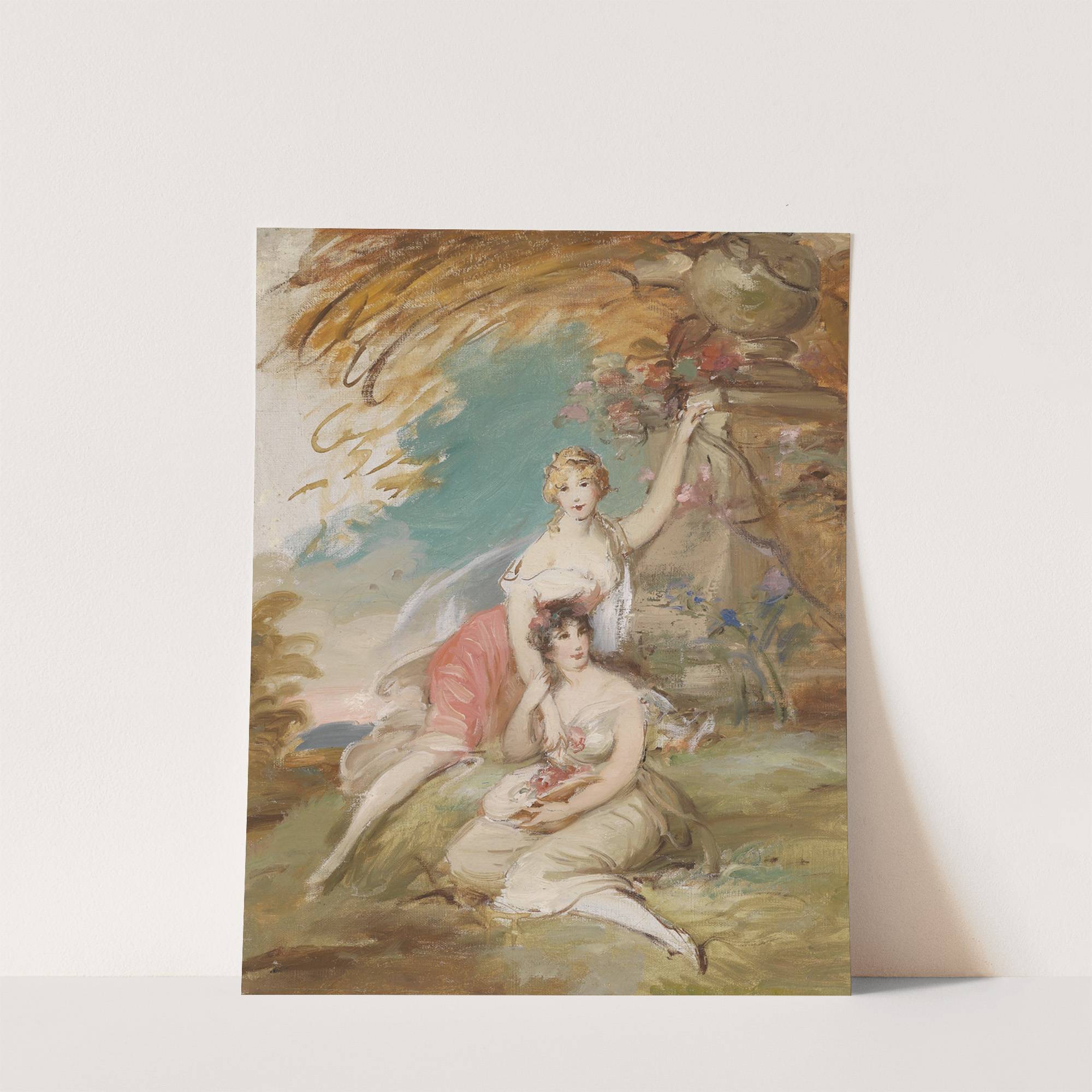 This beautiful art print showcases "Zwei Grazien in Landschaft" by Adolf Pilch, rendered in an elegant Rococo style. The composition features two graceful women seated amidst a lush, verdant landscape that transitions from warm autumnal hues to cool blues and...