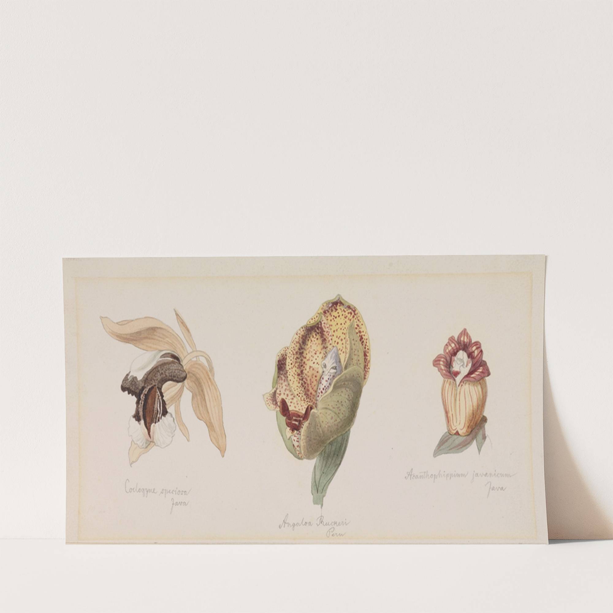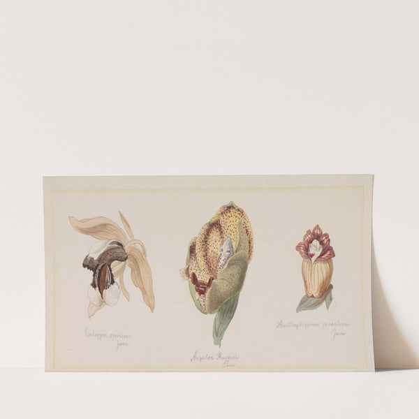 This artwork titled "Drei verschiedene Orchideenblüten" by Adolf Schröter features a beautifully illustrated triptych of three distinct orchid species, each meticulously detailed and vibrant. The leftmost flower showcases delicate, cream-colored petals with intricate brown markings, suggesting elegance and refinement. The...