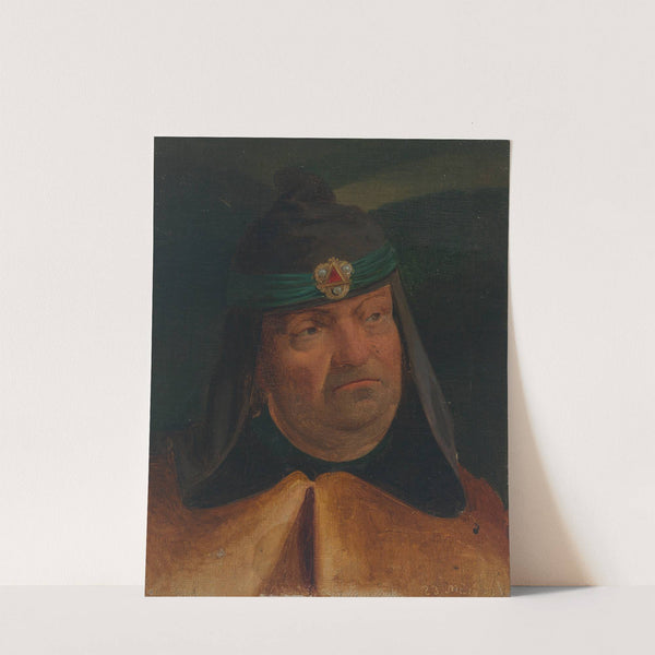 This artwork is "Studie des Kopfes eines Mannes mit Schmuckstirnband über Kappe" by Adolf Schröter. It showcases a richly detailed portrait of an elderly man with a solemn expression. The subject wears a dark brown hooded cloak and a green...