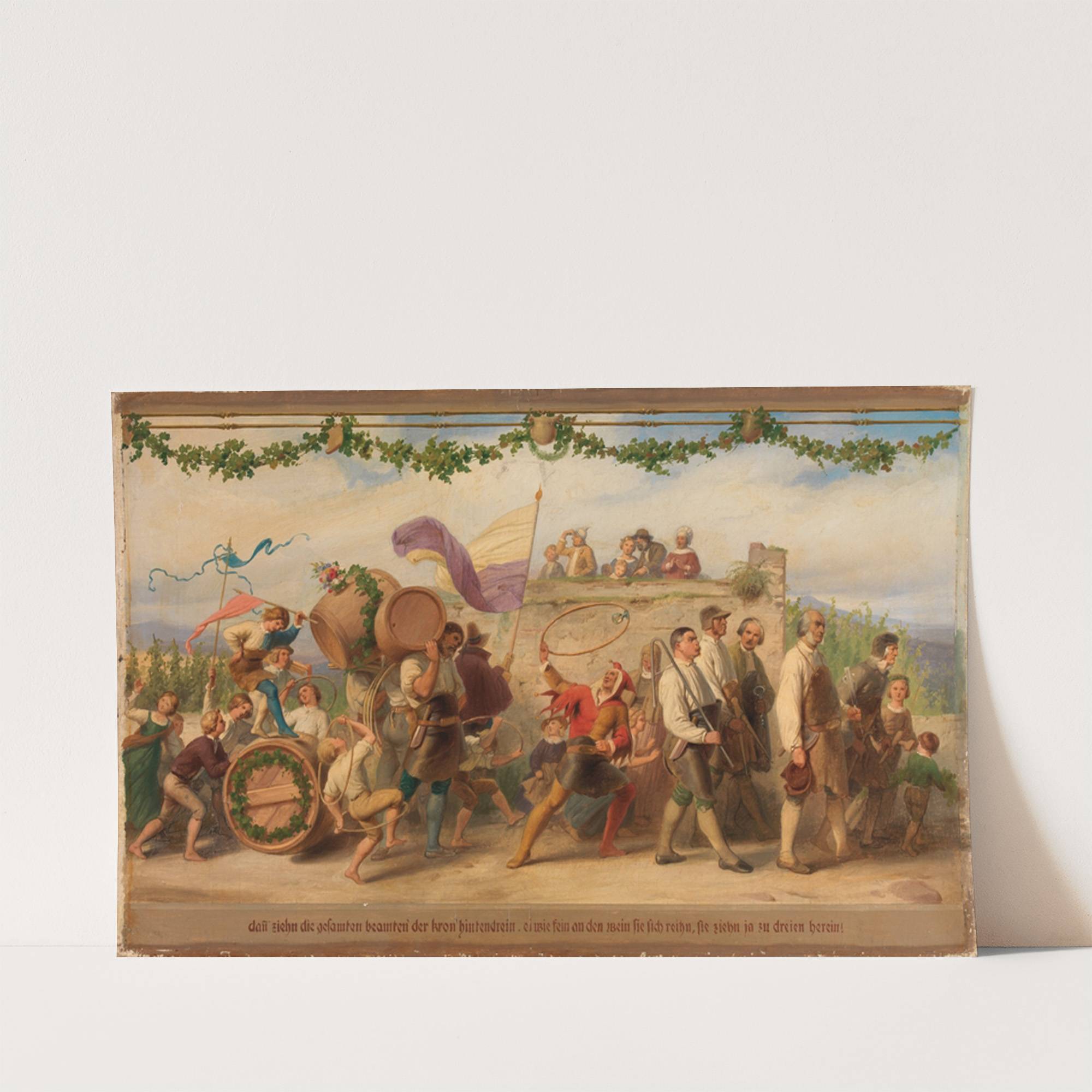 Introduce the artwork titled "Triumph des Königs Wein," created by Adolf Schröter. This vibrant painting depicts a lively village scene celebrating a royal wine harvest. The central focus features a group of villagers enthusiastically engaged in various festive activities. On...