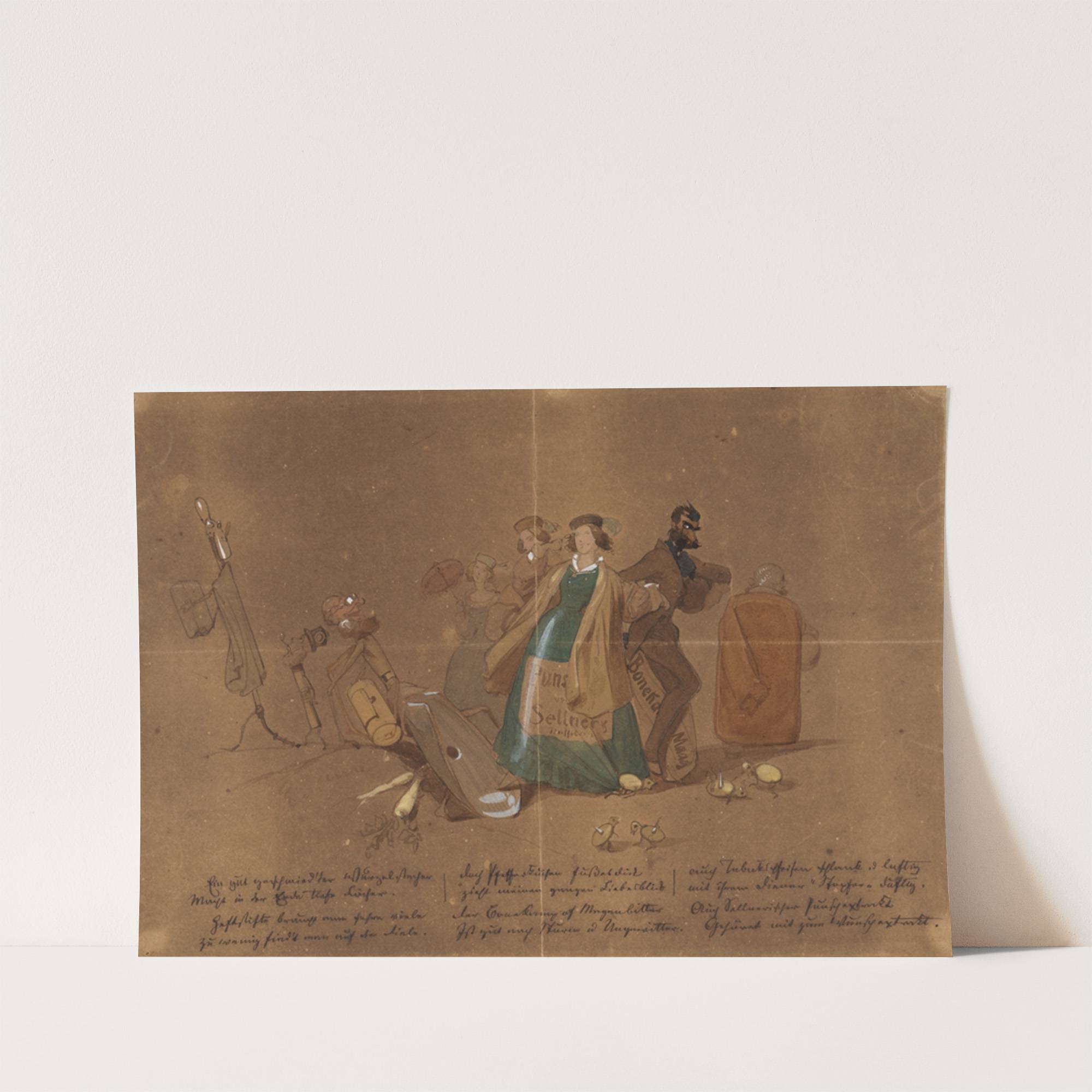 This charming print by Adolf Schröter titled "Weihnachtswunschzettel" beautifully captures the whimsical spirit of Christmas through delicate watercolor illustrations and cursive handwriting. The central figure, a woman with fair skin and rosy cheeks, is depicted wearing a green dress under...