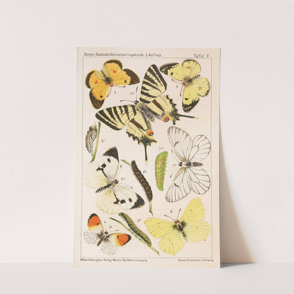 This print features an exquisite collection of butterfly specimens with detailed illustrations, titled "Deutsche Schmetterlingskunde für Anfänger" by Adolf Speyer. Each butterfly is meticulously rendered in vivid colors, showcasing their distinctive patterns and markings. The butterflies are labeled with numbers...