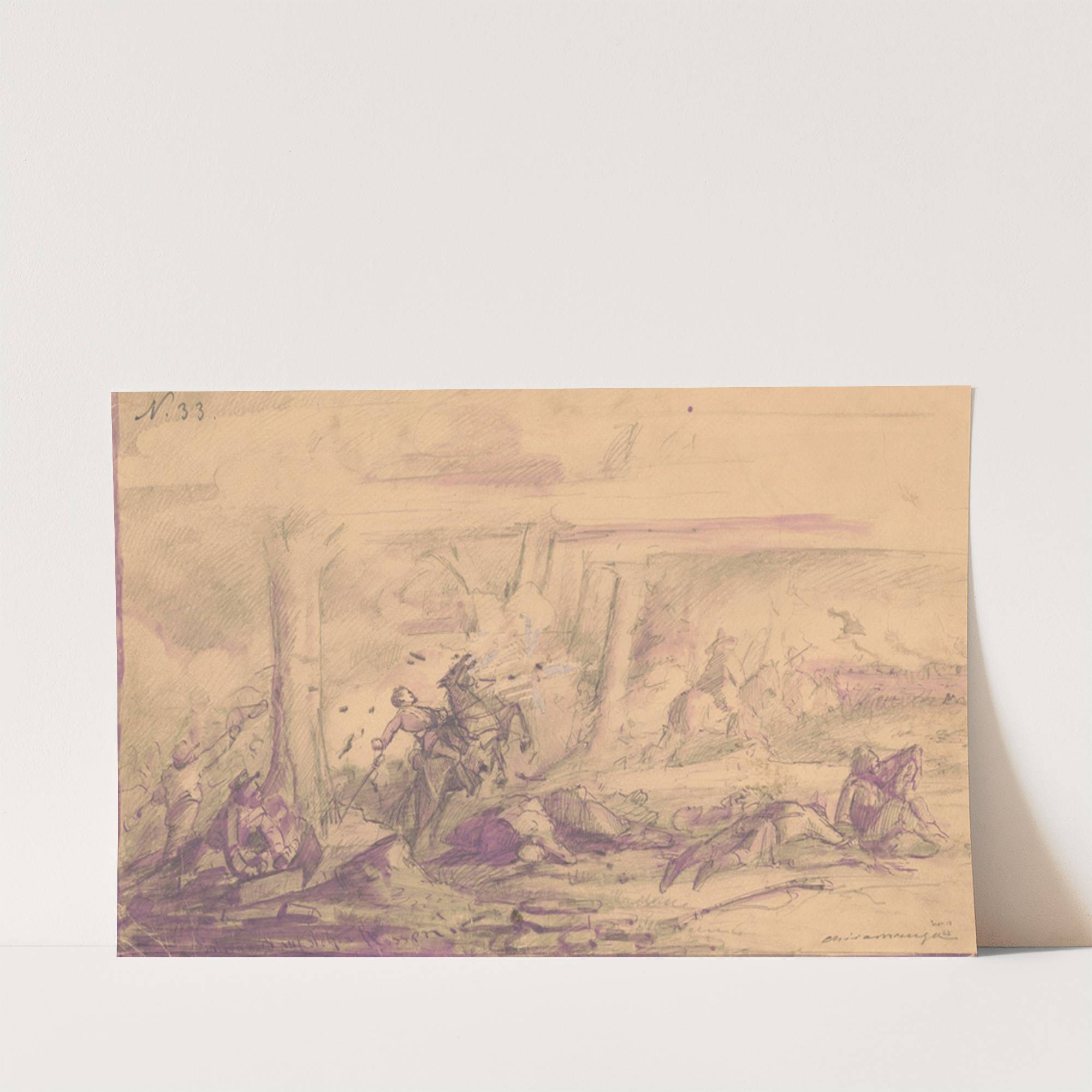 This captivating art print features "Battle of Chickamauga, Georgia, September 19, 1863" by Adolph Metzner. Rendered in a delicate monochromatic palette with soft purples and creamy whites, this sketch-like artwork conveys the chaotic intensity of battle with remarkable precision. In...
