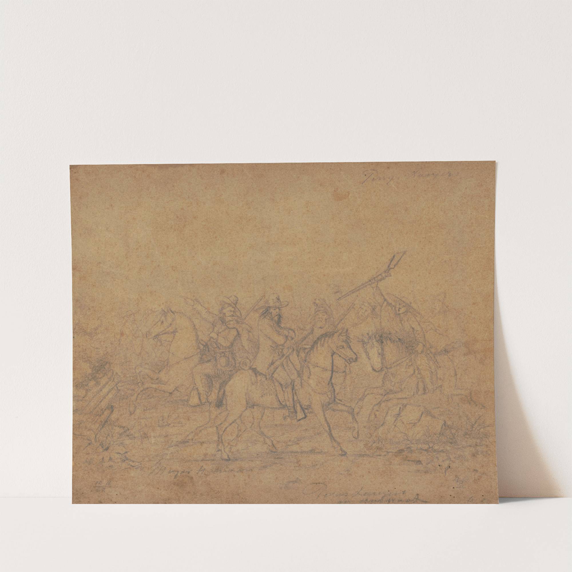 This art print showcases "Texas Rangers" by Adolph Metzner, rendered in delicate pencil sketches on textured beige paper. The image captures the dynamic motion of three horseback riders galloping across an undefined terrain, creating a sense of urgency and movement....