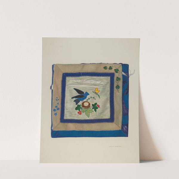 This charming quilted square features "Coverlet (Detail of Bluebird)" by Adolph Opstad, blending traditional craftsmanship with vibrant color. The central panel showcases an intricately stitched scene of bluebirds in mid-flight, one carrying a small yellow butterfly toward a nest adorned...