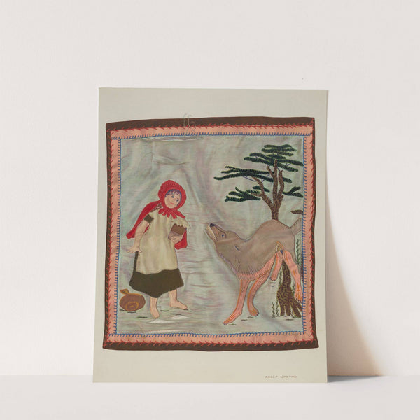This artwork features a traditional-style illustration titled "Coverlet Detail (Red Riding Hood)" by Adolph Opstad. The scene is set in a snowy forest with a soft, pastel color palette. On the left side of the image stands a young girl...