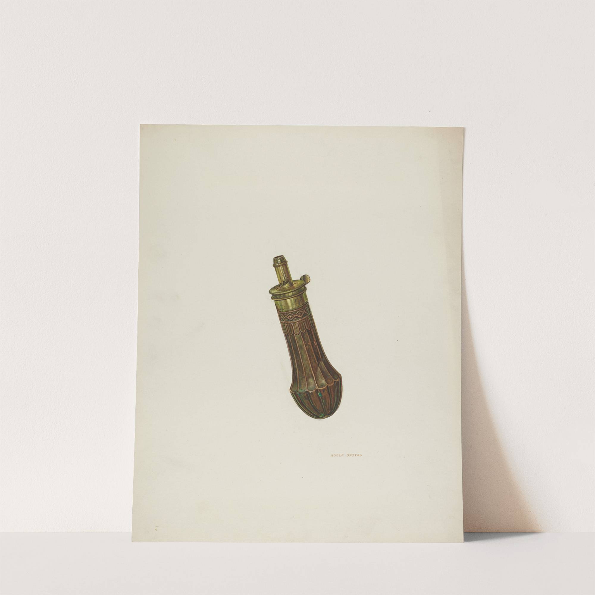 This art print features "Powder Flask" by Adolph Opstad, showcasing a meticulously detailed depiction of an ornate historical object. The powder flask is centrally placed against a clean, white background that highlights its intricate design. The flask has a rich,...