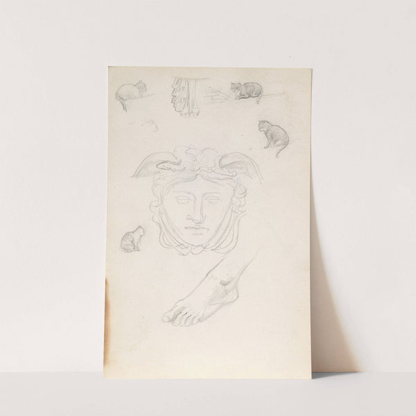 This is an intricately drawn pencil sketch of "Ansiktsrelieff; fyt katten" by Adolph Tidemand, a masterpiece from 1842. The central figure is a detailed and expressive portrait of a cat's face, capturing the animal's sharp features and delicate fur patterns...