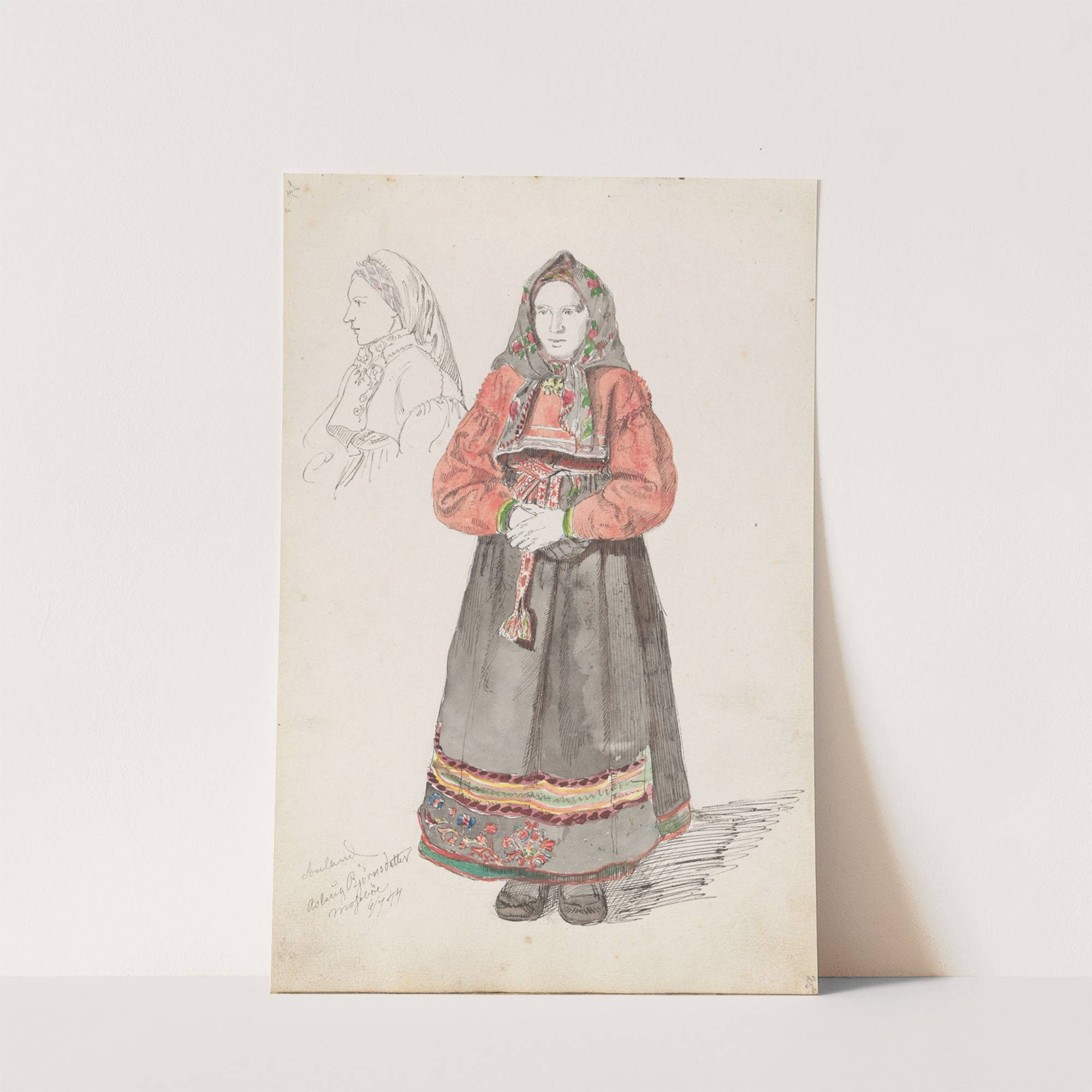 This artwork by Adolph Tidemand, "Aslaug Bjørnsdatter Mosebø," showcases a traditional Nordic peasant woman in exquisite detail. The figure stands with a composed expression, her hands clasped gently in front of her. She is adorned in a vibrant red blouse...