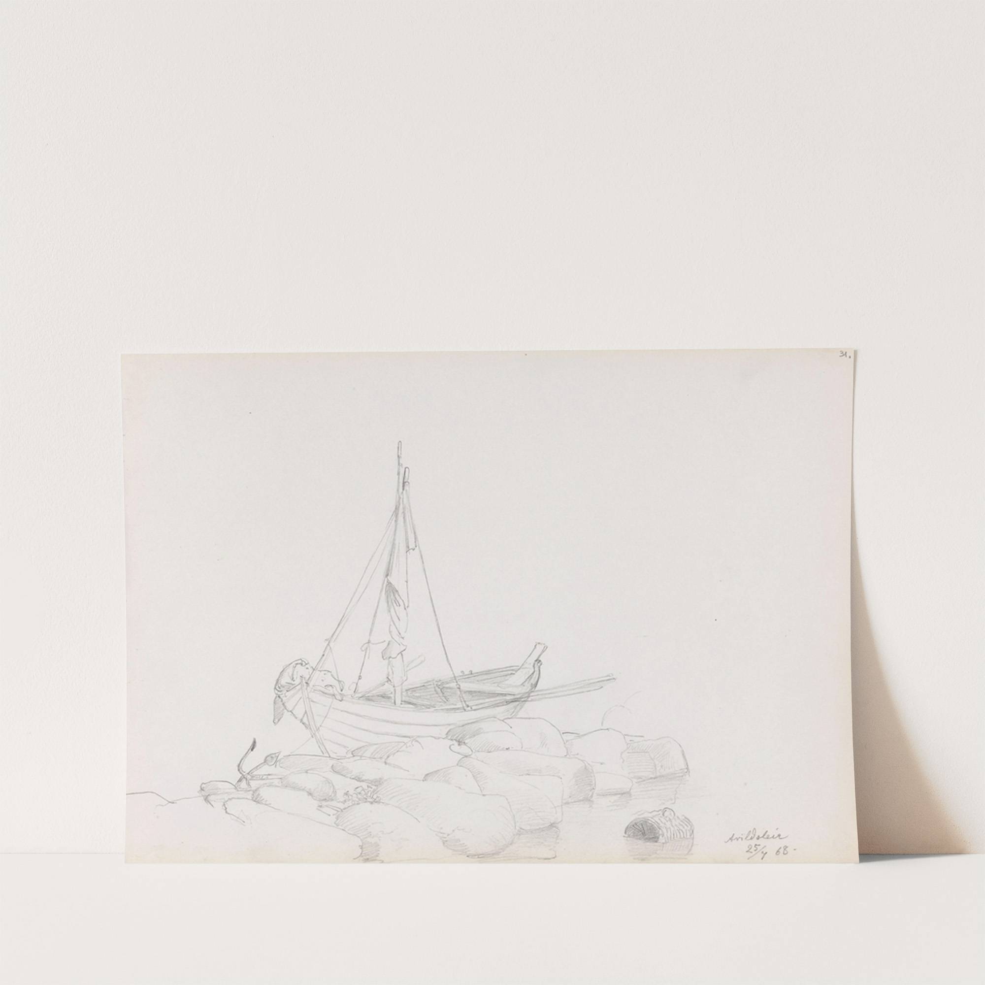 This black-and-white line drawing captures the serene beauty of a sailboat at anchor. Created by Adolph Tidemand in 1868, this artwork showcases delicate, precise lines that evoke a sense of calm and simplicity. The sailboat is depicted from a slightly...