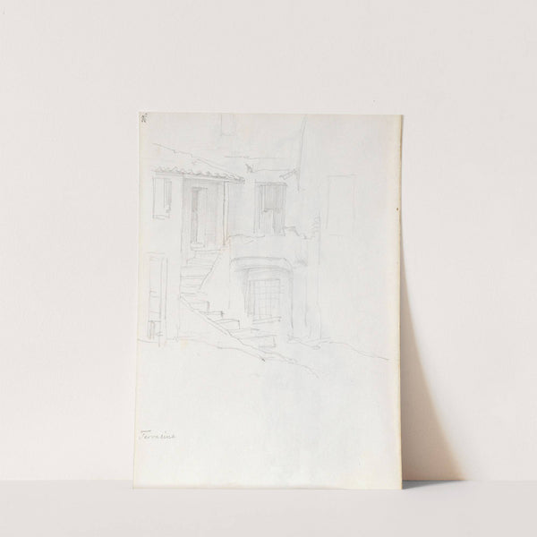 This is a delicate line drawing titled "Bebyggelse i Terracina" created by the artist Adolph Tidemand in 1842. The image showcases an architectural scene with fine, precise lines that depict the structure of a building. The composition features vertical and...