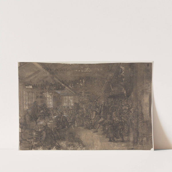 This sepia-toned lithograph captures the bustling atmosphere of a historical interior scene, "Bondebryllup i et interiør" by Adolph Tidemand. The artwork features a crowded room filled with people, suggesting an event or gathering taking place within what appears to be...