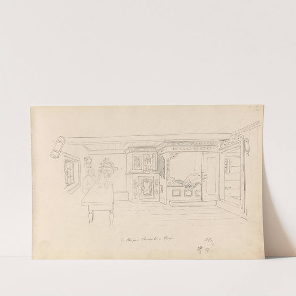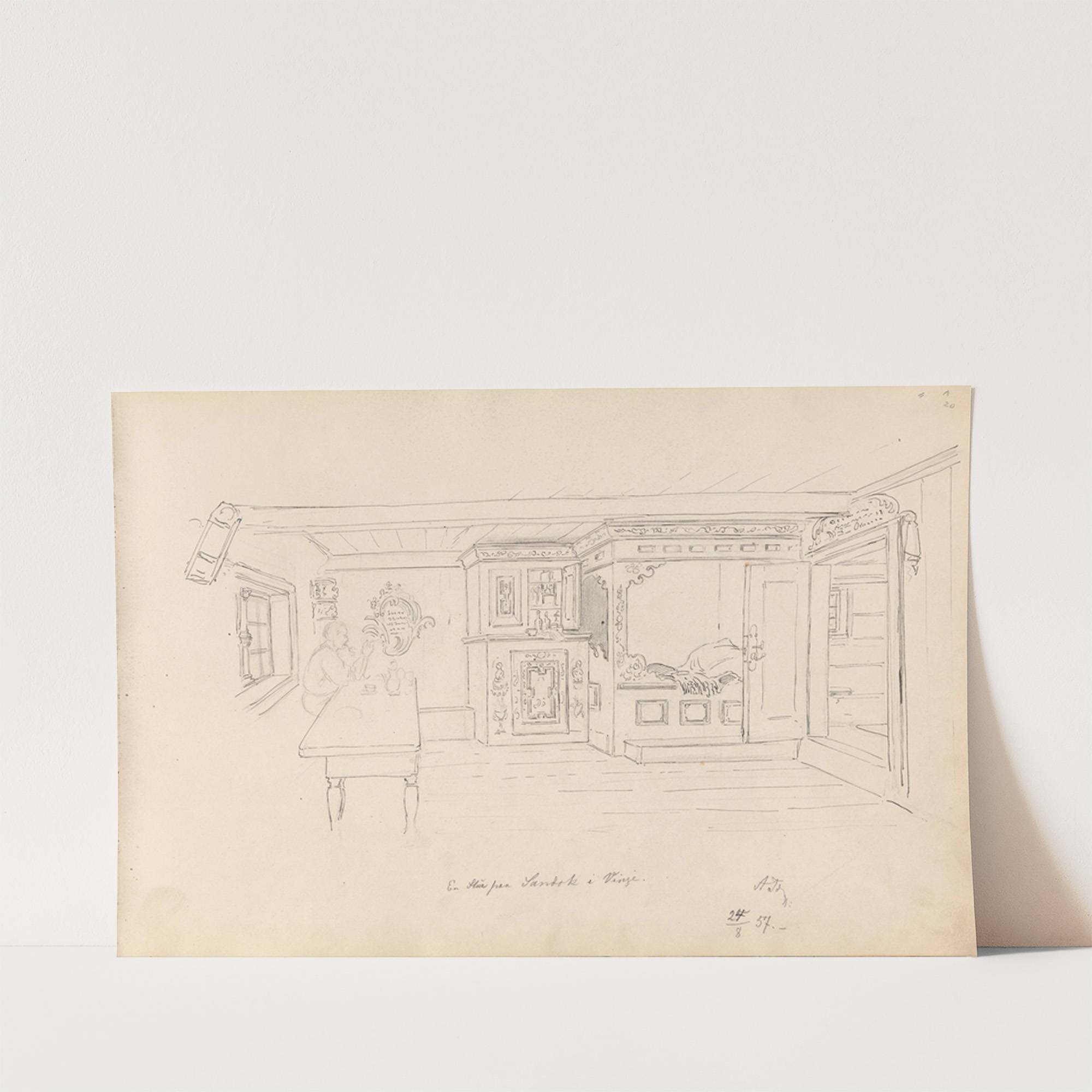 This black-and-white line drawing titled "Bondestue, Sandåki i Vinje (1857)" by Adolph Tidemand captures an early 19th-century Scandinavian interior. The artist uses delicate, precise lines to depict a cozy room filled with period furniture and decorative elements. On the left...