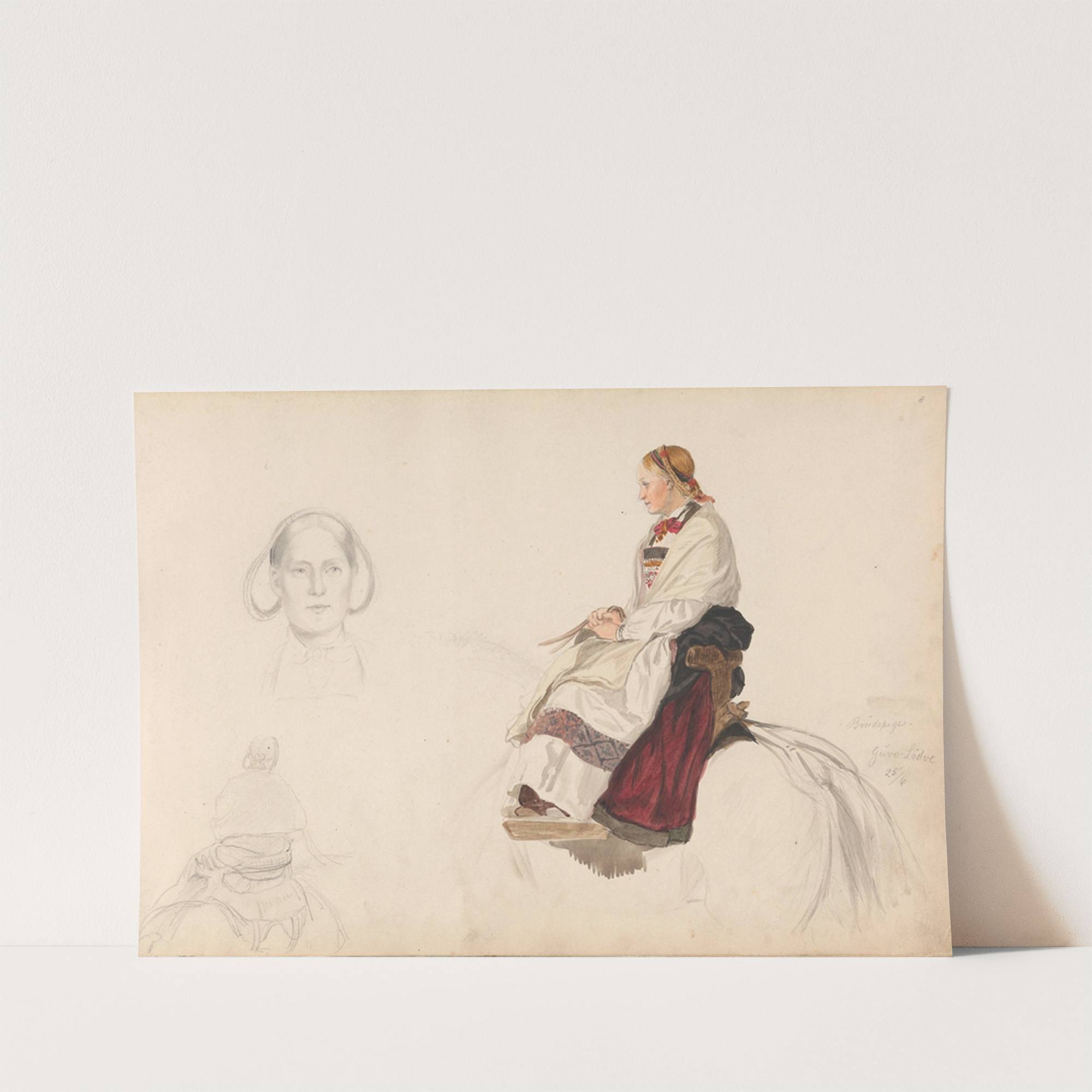 This art print features "Vossevangen" by Adolph Tidmand, rendered in a delicate watercolor style. The central figure is a serene woman, depicted seated and facing slightly to the left. She is adorned in traditional Nordic attire, consisting of a white...