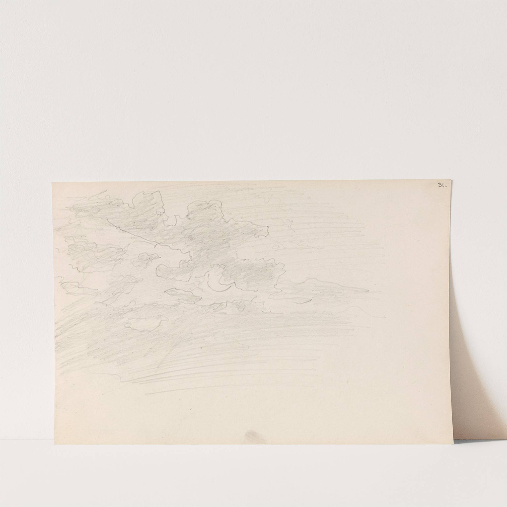 This is "Cloud Study" by Adolph Tidemand, a masterpiece from the 1850s. The print features an intricate line drawing of wispy clouds on a stark white background. Delicate, thin lines create a sense of softness and ethereality as they weave...