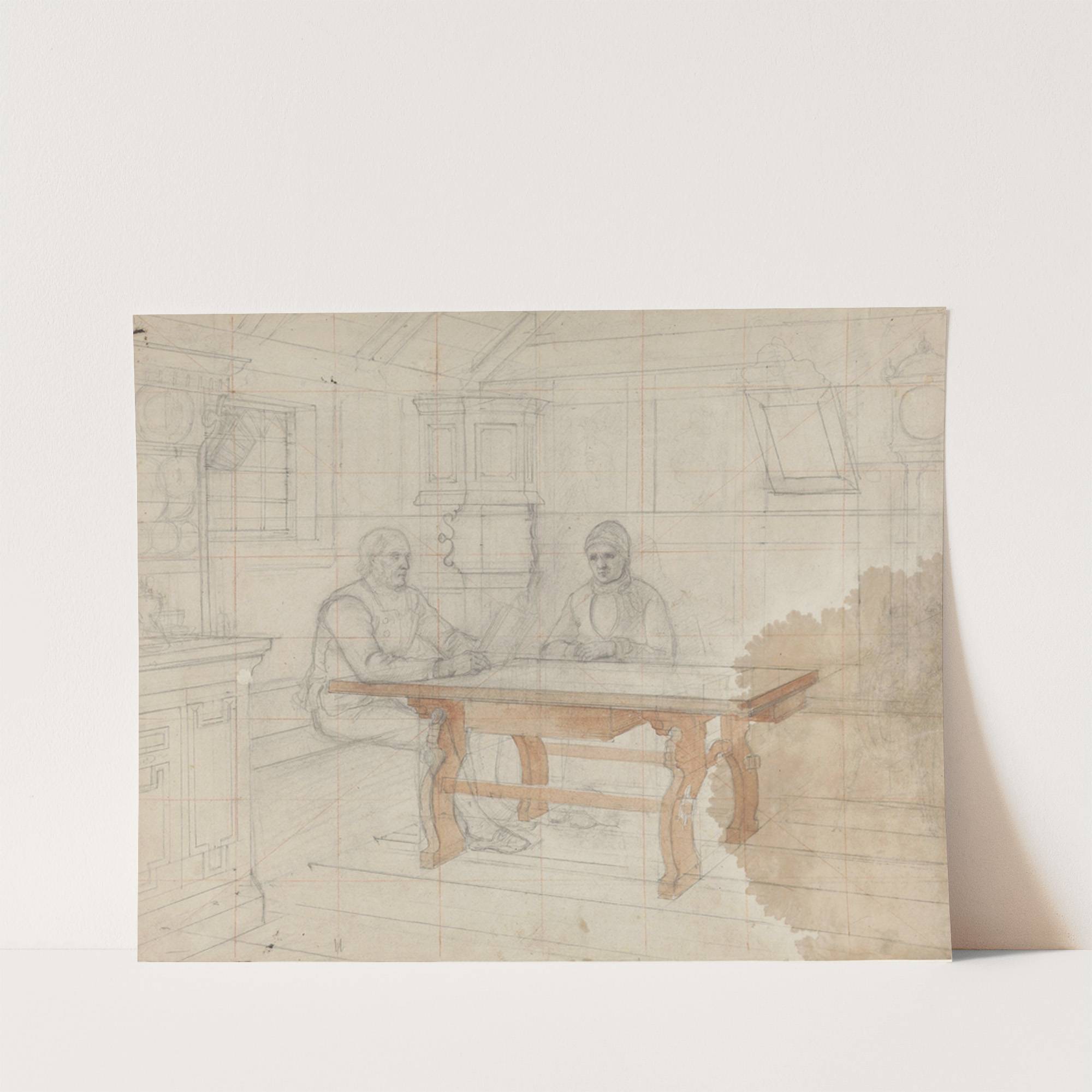 This artwork is "De ensomme gamle" (1848) by Adolph Tidemand, rendered in a delicate pencil and watercolor sketch style. It captures an intimate moment between two elderly individuals seated at a wooden table within a cozy, softly-lit interior space. The...