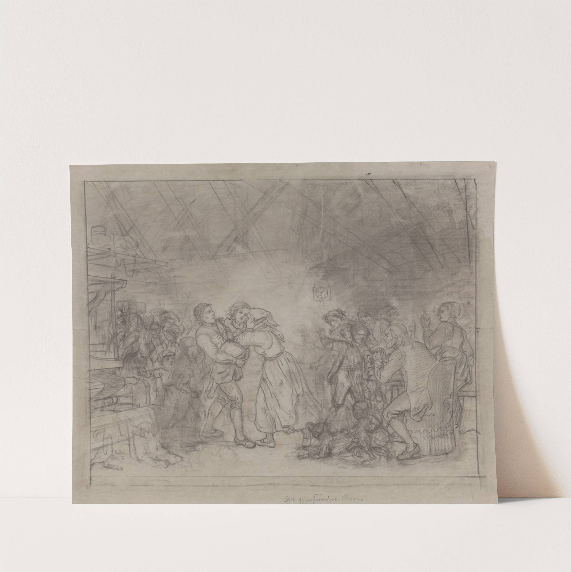 This monochromatic pencil drawing by Adolph Tidemand titled "Det Gjenfundne Barn" captures a poignant biblical scene with remarkable emotional depth. The artist uses delicate, precise lines to depict the intricate details of the figures and their surroundings. At the center,...
