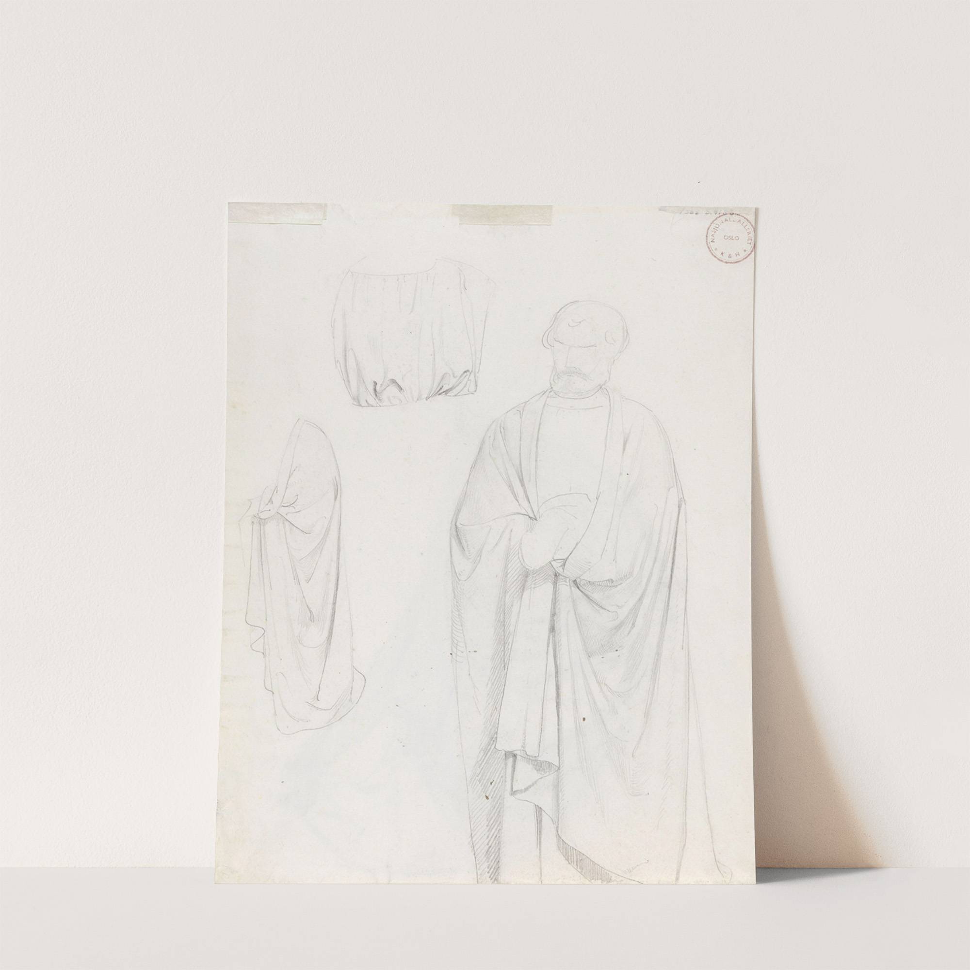 This art print features a delicate pencil sketch by Adolph Tidemand titled "Draperistudier". The composition showcases two figures in classic drapery garments, expertly rendered with fine, precise lines that capture the softness and movement of the fabric. The central figure...