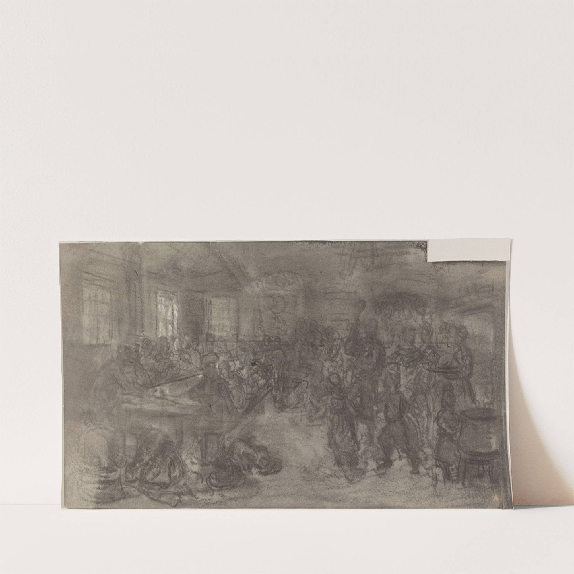This artwork is a monochromatic pencil drawing titled "Et bondebryllup" by Adolph Tidemand. It depicts a bustling indoor scene filled with activity. In the foreground, a group of people sit and stand around tables, engaged in conversation and interaction. Their...