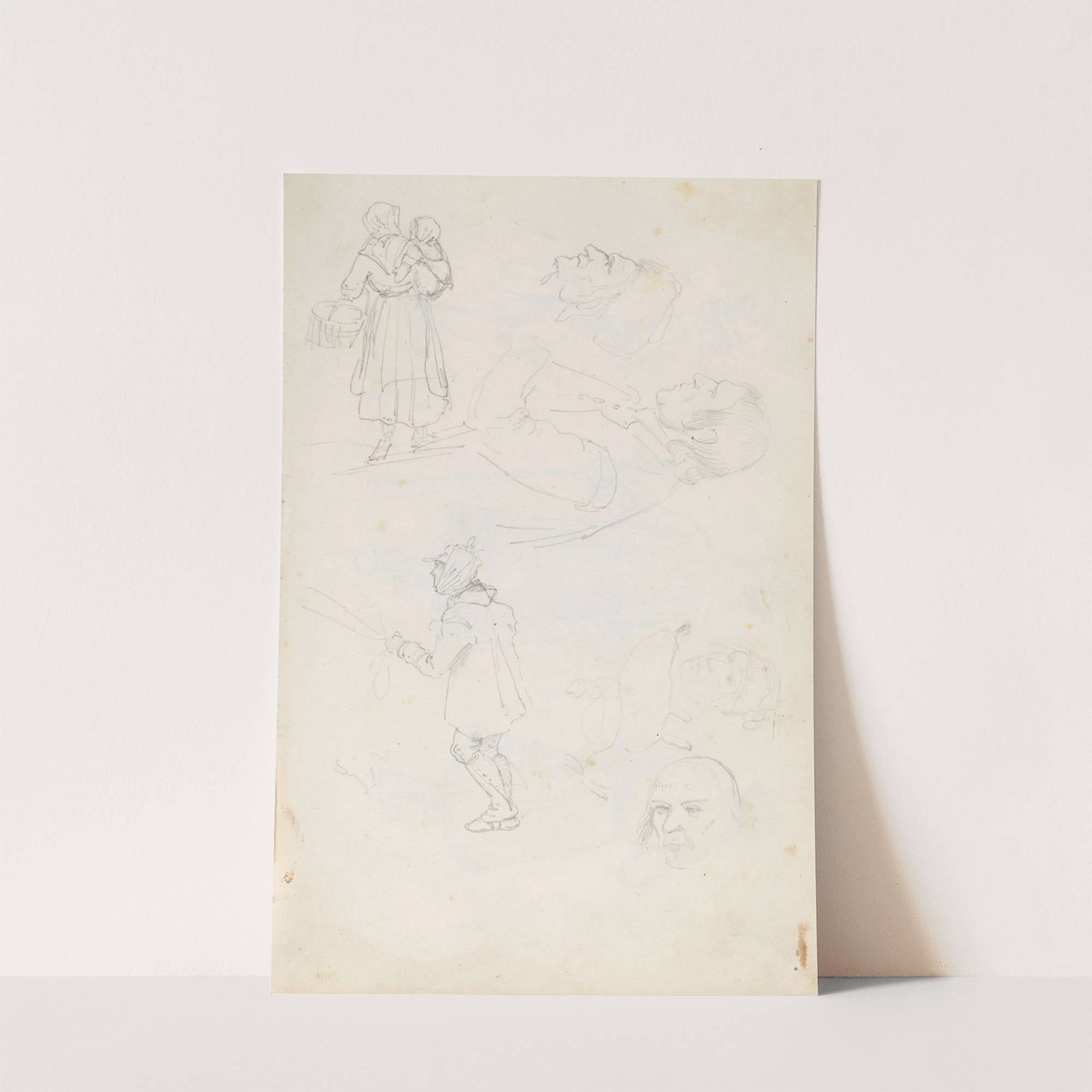 This art print features a delicate line drawing in the style of Adolph Tidemand's "Figure Studies" from between 1844 and 1854. The sketch, done in fine, light pencil lines, showcases three distinct human figures interacting in a minimalist composition.At the...