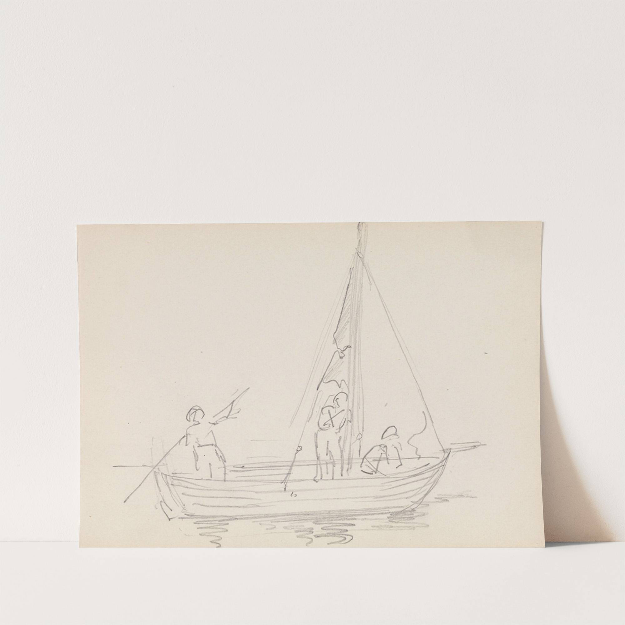 This black-and-white line drawing titled "Figurer i båt" by Adolph Tidemand captures a serene maritime scene. The composition features five individuals onboard a small boat, depicted with simple yet effective lines that convey movement and interaction. On the left side...