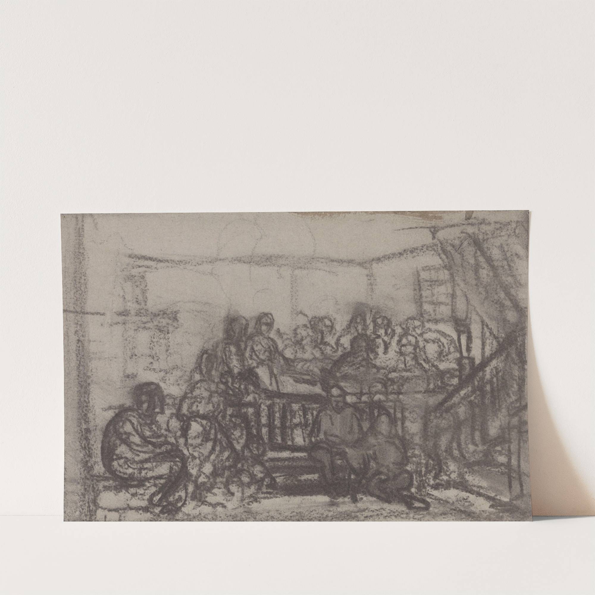 This artwork is titled "Figurer i Interiør" (People in an Interior) by Adolph Tidemand. It's a monochromatic sketch rendered in dark, fluid charcoal lines on a textured, off-white background. The composition depicts a group of figures engaged in various activities...
