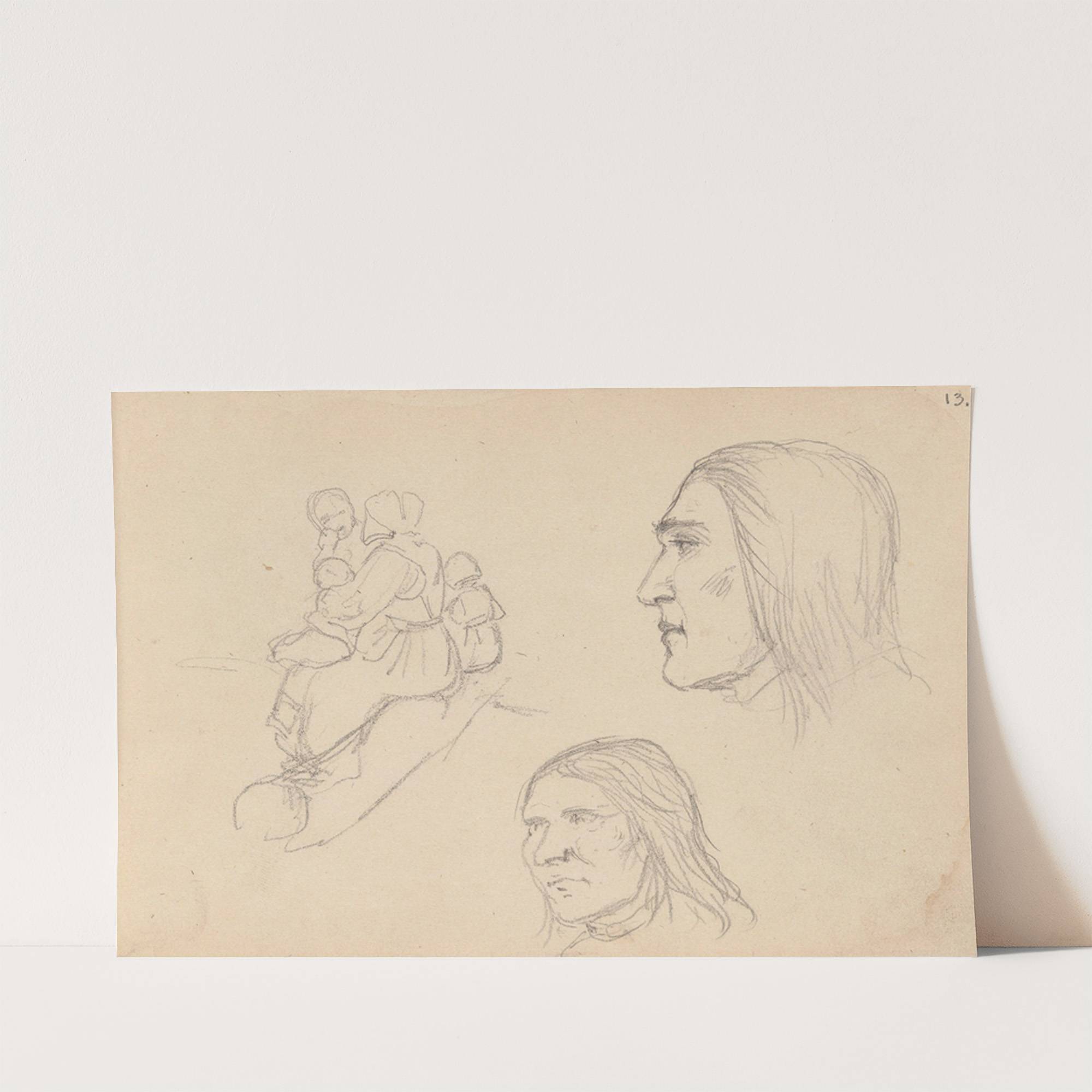 This delicate pencil sketch features three separate studies of figures in various poses and profiles. On the left side of the canvas, there is a loosely sketched figure seated with another figure partially visible behind them, suggesting an intimate or...