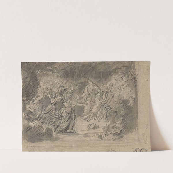 This elegant artwork is "Figurkomposisjon" by the renowned artist Adolph Tidemand, created with delicate pencil strokes on aged paper that gives it a timeless quality. The composition features a dynamic gathering of figures, rendered in soft shades of gray and...
