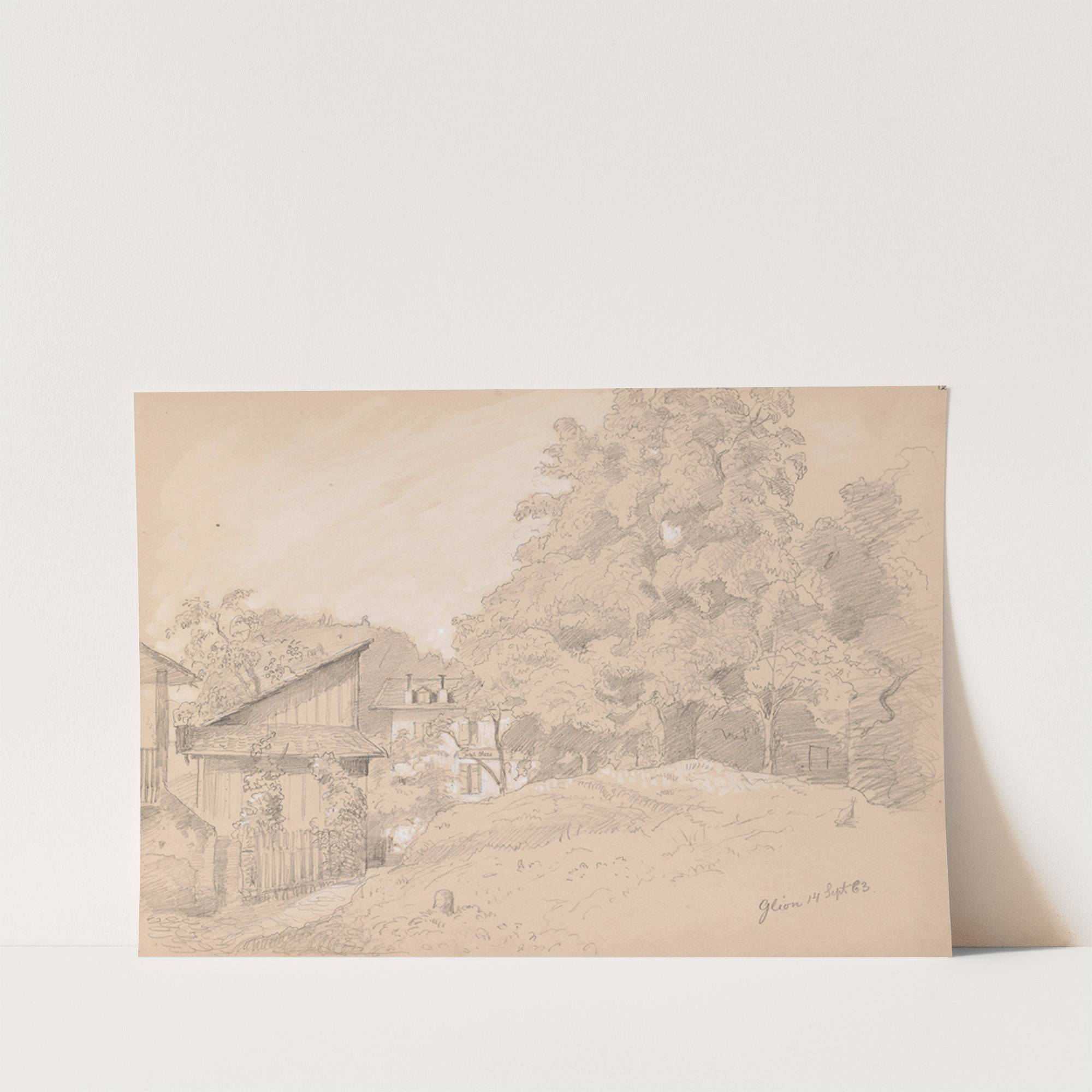 This beautifully rendered black-and-white pencil drawing captures the serene charm of a rural scene. Created by artist Fra Glion in 1863, as noted by the signature in the bottom right corner, the piece depicts a quiet countryside setting. On the...