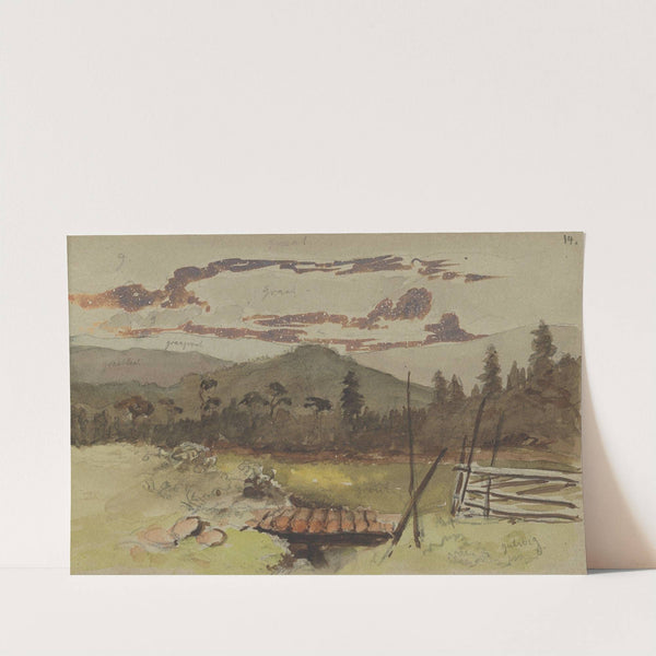 This enchanting landscape print showcases "Fra Gulsvik" by the renowned artist Adolph Tidemand. The painting features a serene countryside scene with a rustic wooden bridge stretching across a gentle stream in the foreground. The bridge has a weathered, natural look,...