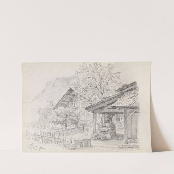 This beautifully detailed monochrome drawing captures a tranquil village scene, evoking a sense of nostalgia and timeless charm. The artist, Fra Meiringen, masterfully uses pencil to bring this rural setting to life. In the foreground, a rustic wooden porch with...