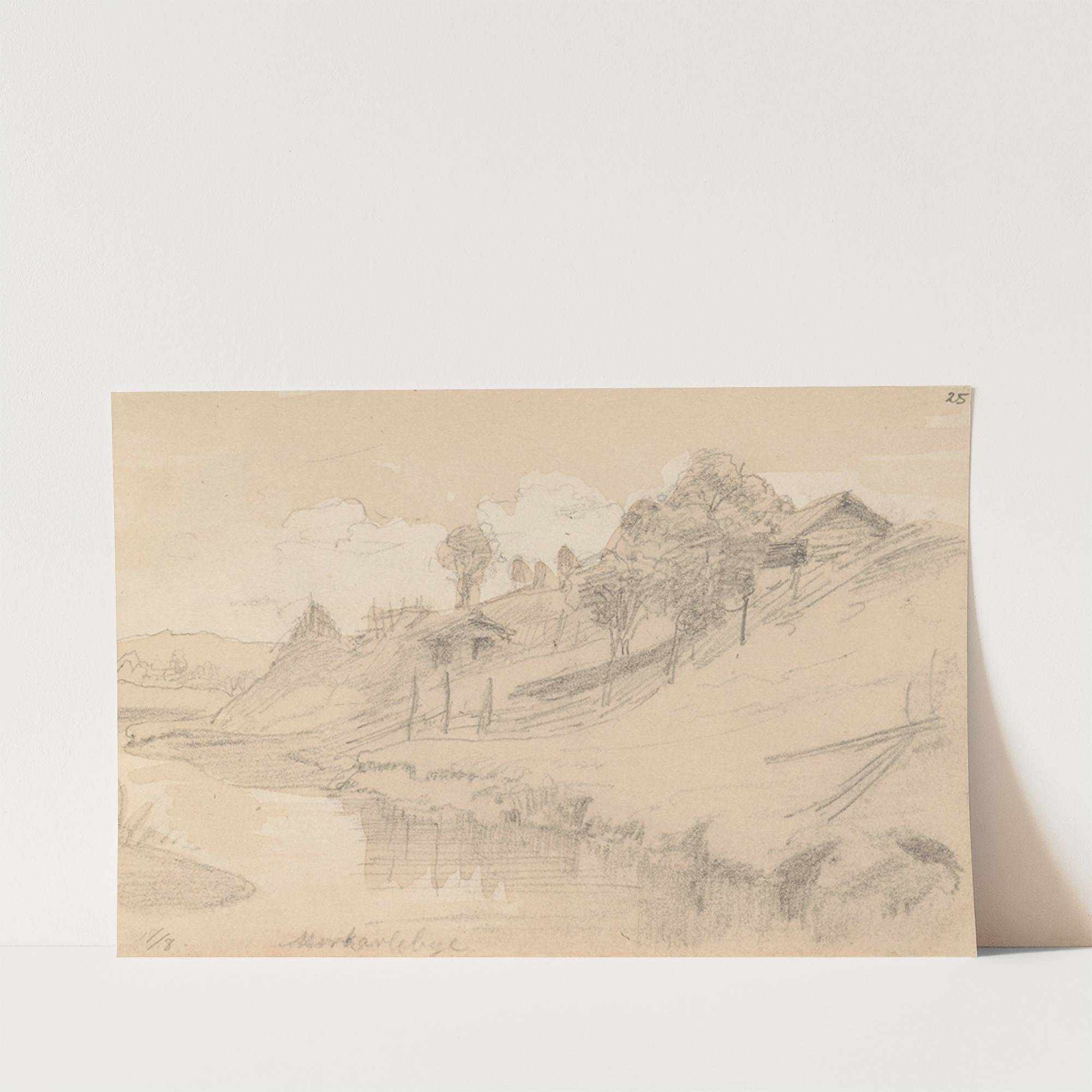 Experience the serene beauty of nature with this delicate pencil sketch titled "Fra Morkarlby" by Adolph Tidemand. This charming artwork captures a tranquil landscape, characterized by gentle rolling hills, sparse trees, and rustic farmhouses set against a softly lit sky....