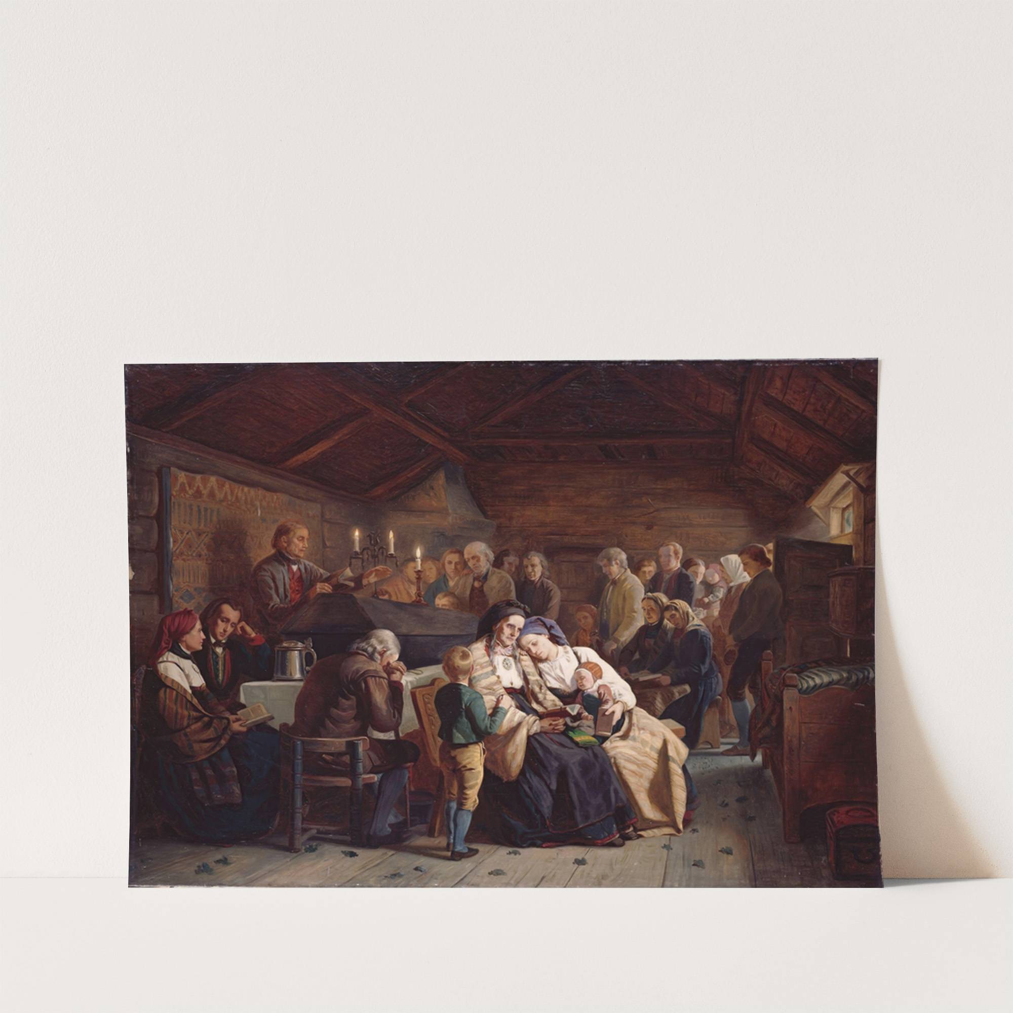 This evocative painting titled "Funeral Feast" by Adolph Tidemand beautifully captures a rustic village gathering in the mid-19th century. The warm, earthy color palette of browns, greens, and soft yellows enhances the cozy, communal atmosphere of the scene. In the...