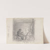 This black-and-white sketch captures the charming scene of two figures seated in a cozy interior setting reminiscent of a rustic brewery. The artist, Adolph Tidemand, has expertly employed fine, cross-hatching strokes to create a sense of depth and texture. On...