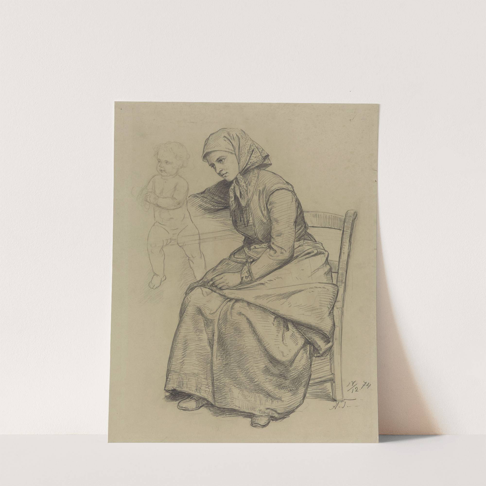 This exquisite art print captures a poignant moment in history, skillfully rendered by the renowned artist Adolph Tidemand in 1874. The monochromatic drawing features a somber yet serene figure of a woman seated on a simple wooden chair. Her head...