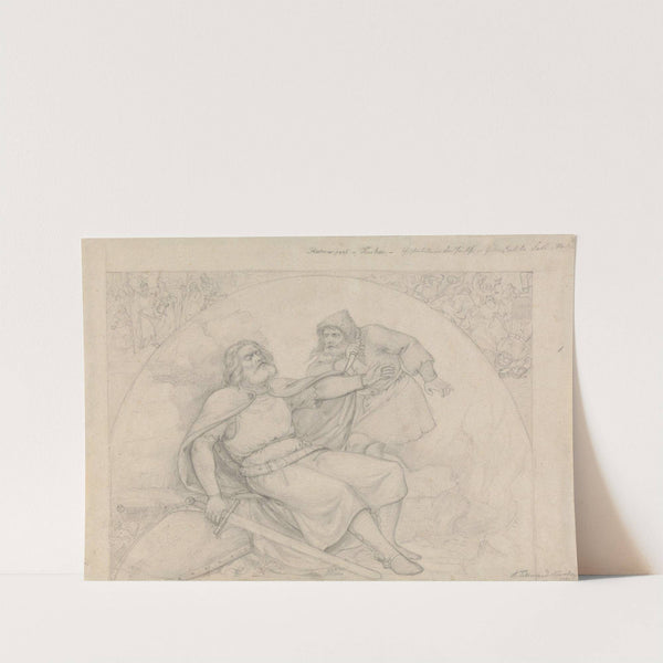 This artwork is a meticulously detailed pencil drawing titled "Håkon Jarl og Karker" by the renowned artist Adolph Tidemand, created in 1841. The scene features two main figures: an elderly man and a younger man, engaged in an intimate gesture...