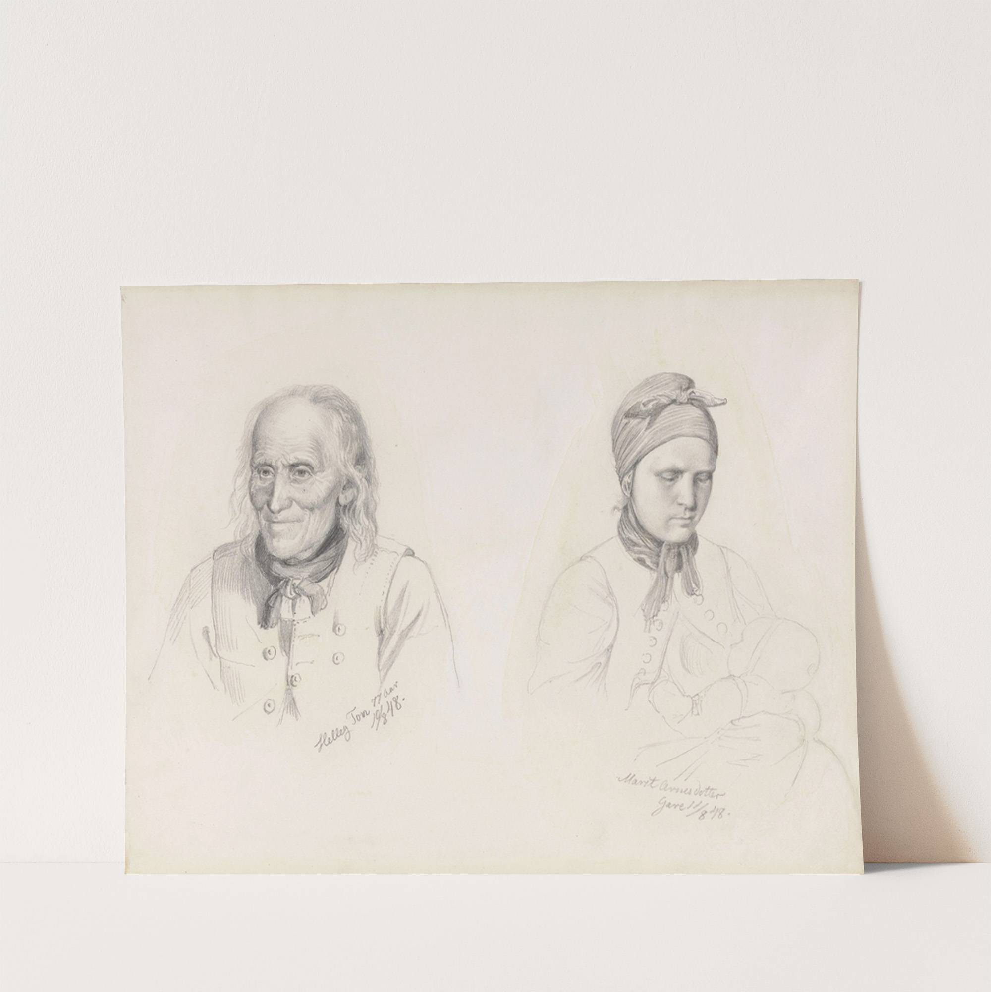 This art print features two meticulously detailed pencil sketches of historical figures. On the left is an elderly man with long hair, wearing a buttoned coat and a scarf, displaying a gentle smile. His facial expression conveys wisdom and kindness....