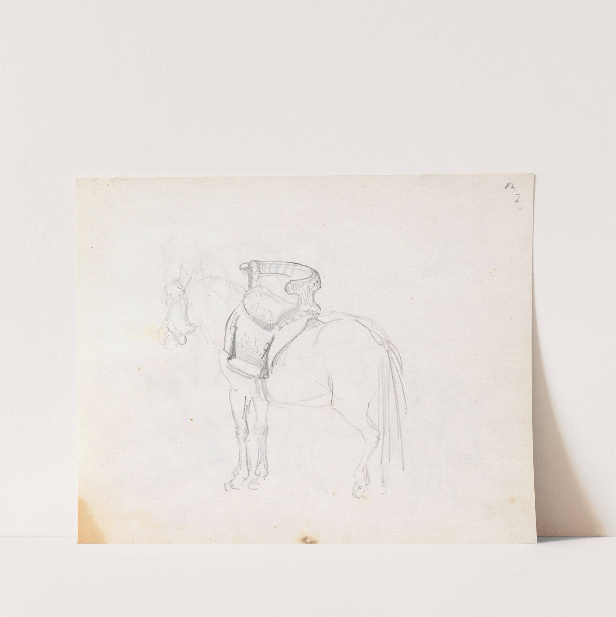 This art print features "Hest med tverrsal" by Adolph Tidmand, a minimalist sketch rendered in delicate pencil lines on a white background. The subject of the drawing is a horse, depicted with gentle curves and soft shading that highlight its...