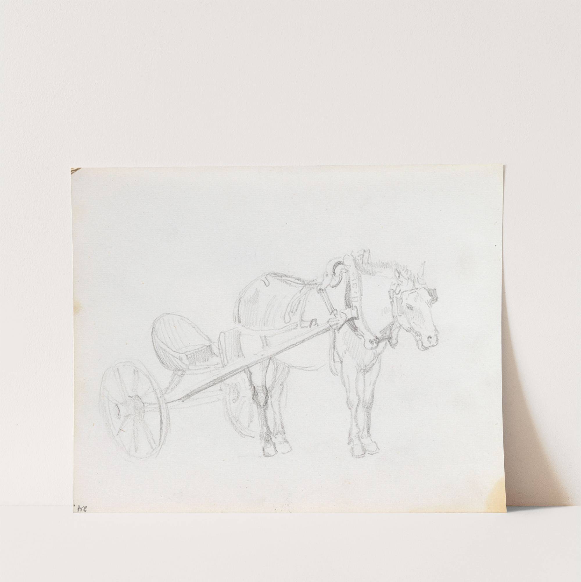 This art print features "Hest og karjol" by Adolph Tidemand, a beautifully detailed pencil sketch depicting an elderly farmer guiding his ox through the countryside. The delicate lines of the drawing capture the gentle yet determined posture of both the...