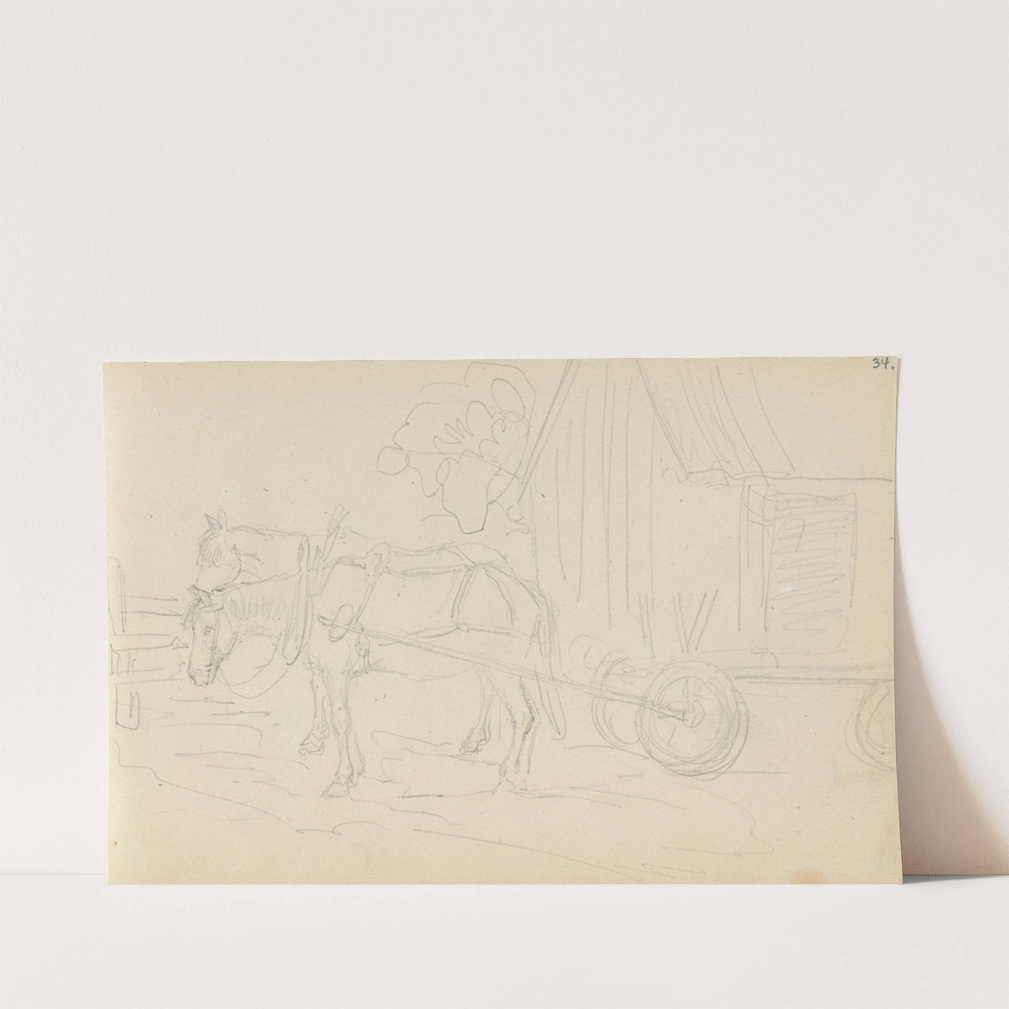This line drawing, "Hester med vogn" by Adolph Tidemand (1852), depicts a historical scene with fine, delicate pencil work. The composition features a woman seated in a horse-drawn carriage, positioned slightly to the left of center. She is dressed in...
