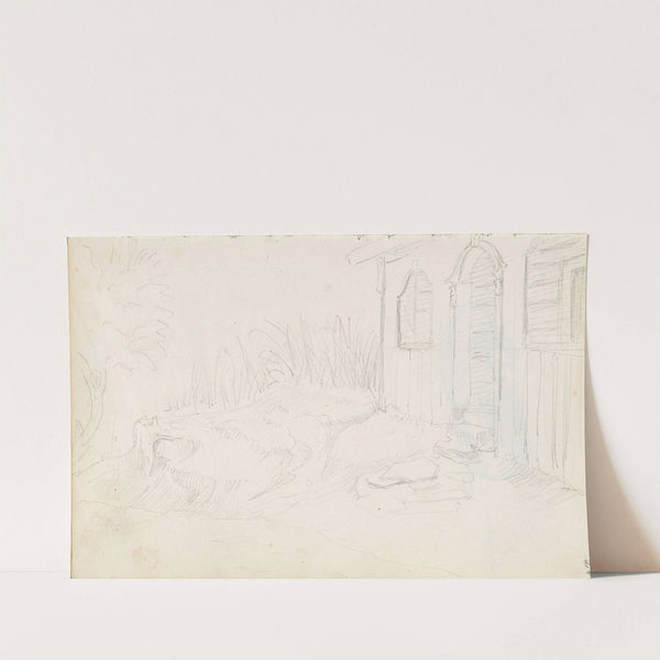This artwork is "Hus ved skrent" (1844) by Adolph Tidemand, showcasing a delicate line drawing style. The image features minimalistic yet detailed outlines of rural architecture, including what appears to be a house with tall windows and a peaked roof...