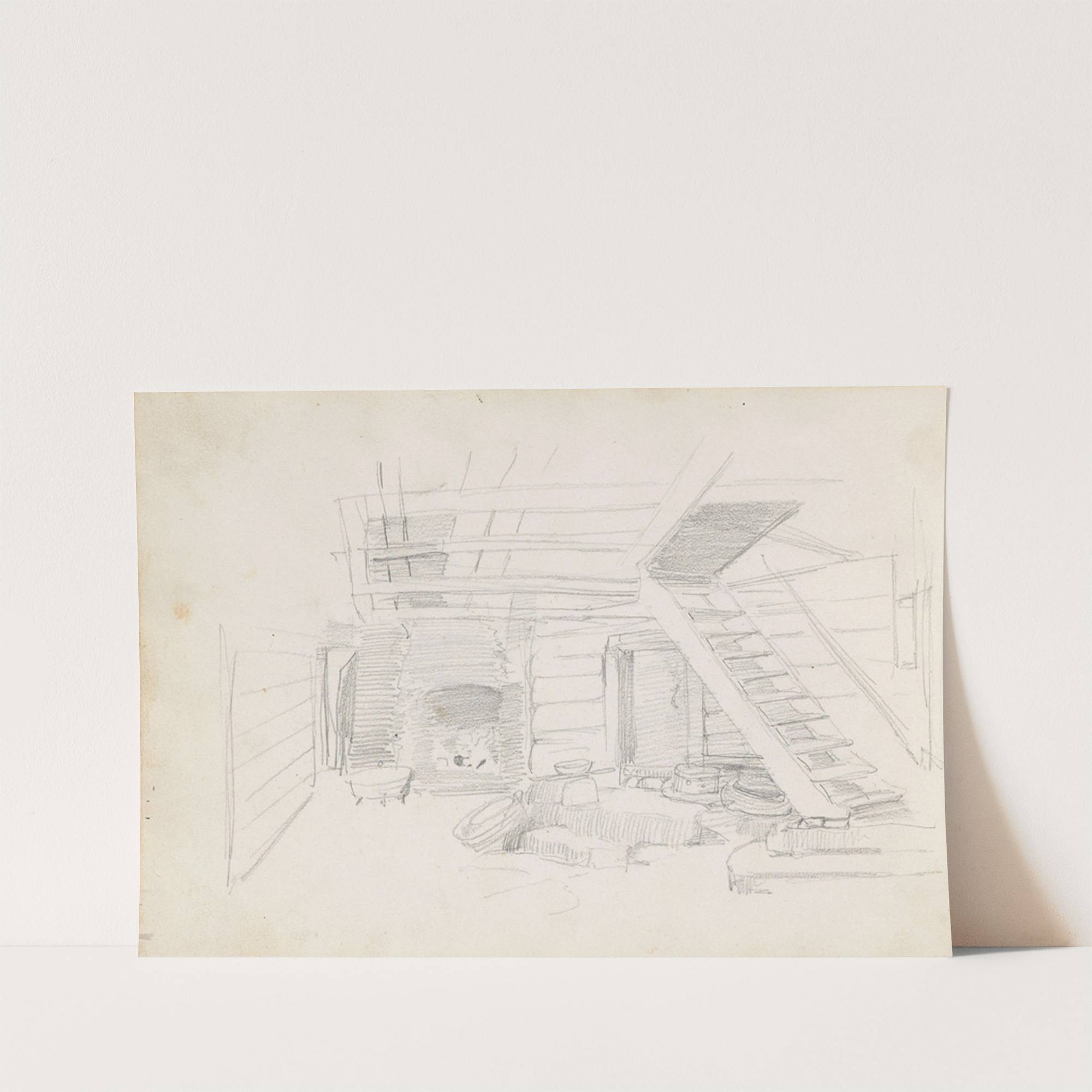 This black-and-white line drawing captures the intricate details of an interior space with meticulous cross-hatching technique. The composition focuses on a geometrically complex room featuring a mix of vertical and horizontal lines that intersect to form various shapes and structures,...