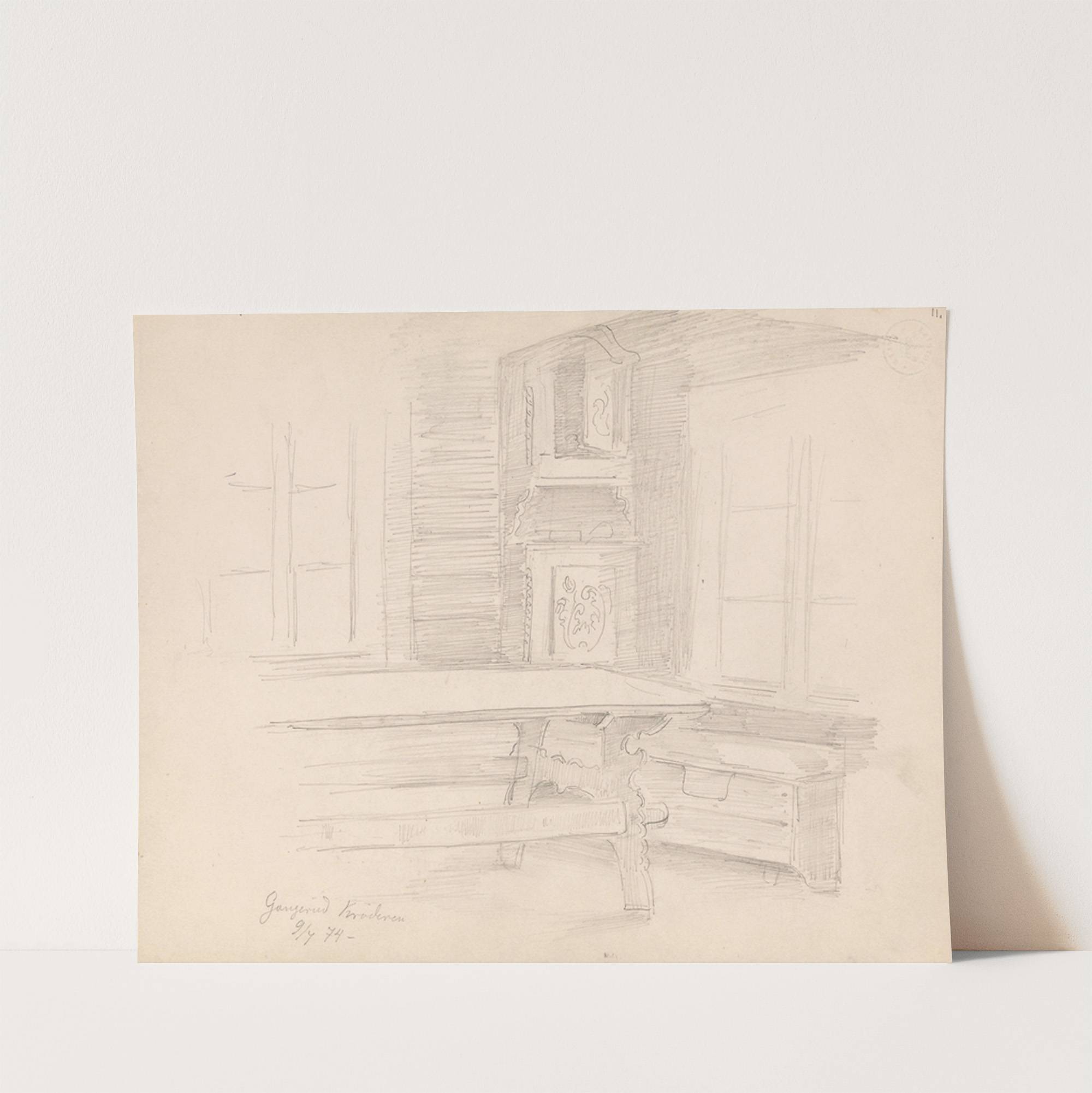 This delicate line drawing captures the essence of rustic simplicity with "Interiør fra stue ved Krøderen" by Adolph Tidemand. Rendered in soft pencil, the artwork showcases a wooden interior space with precise yet gentle lines that bring out the textures...