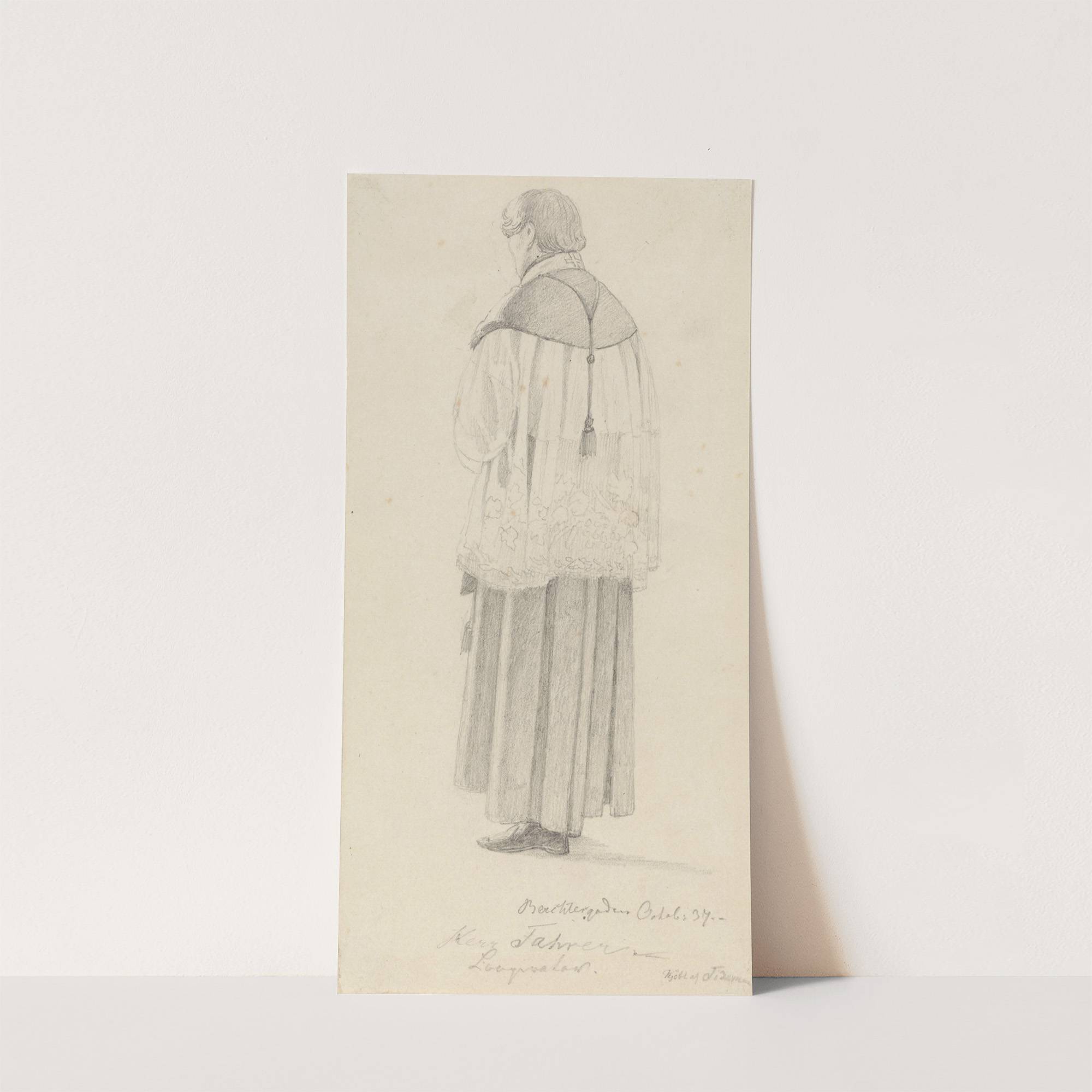 This art print features "Katolsk geistlig, Berchtesgaden (1837)" by Adolph Tidemand, rendered in a delicate pencil drawing style. The subject is a Catholic cleric viewed from the back, standing slightly to one side. He wears a traditional long robe with...