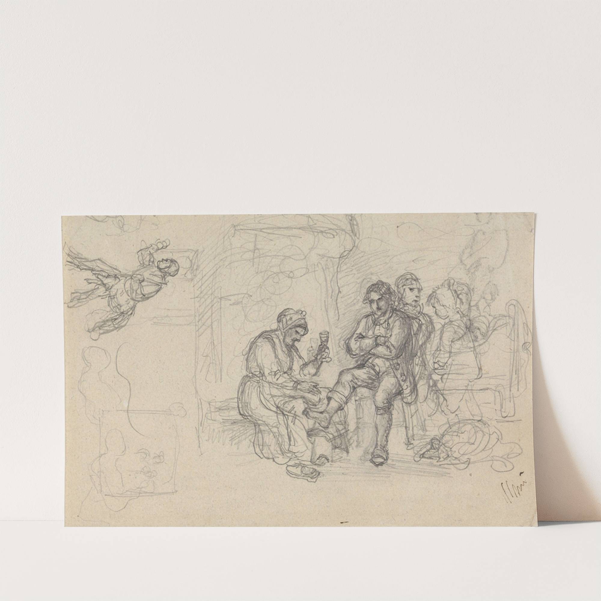This captivating pencil sketch depicts a lively street scene with four men enjoying a social moment in what appears to be an urban setting. The primary focus is on three men sitting closely together on a bench, engaged in conversation...