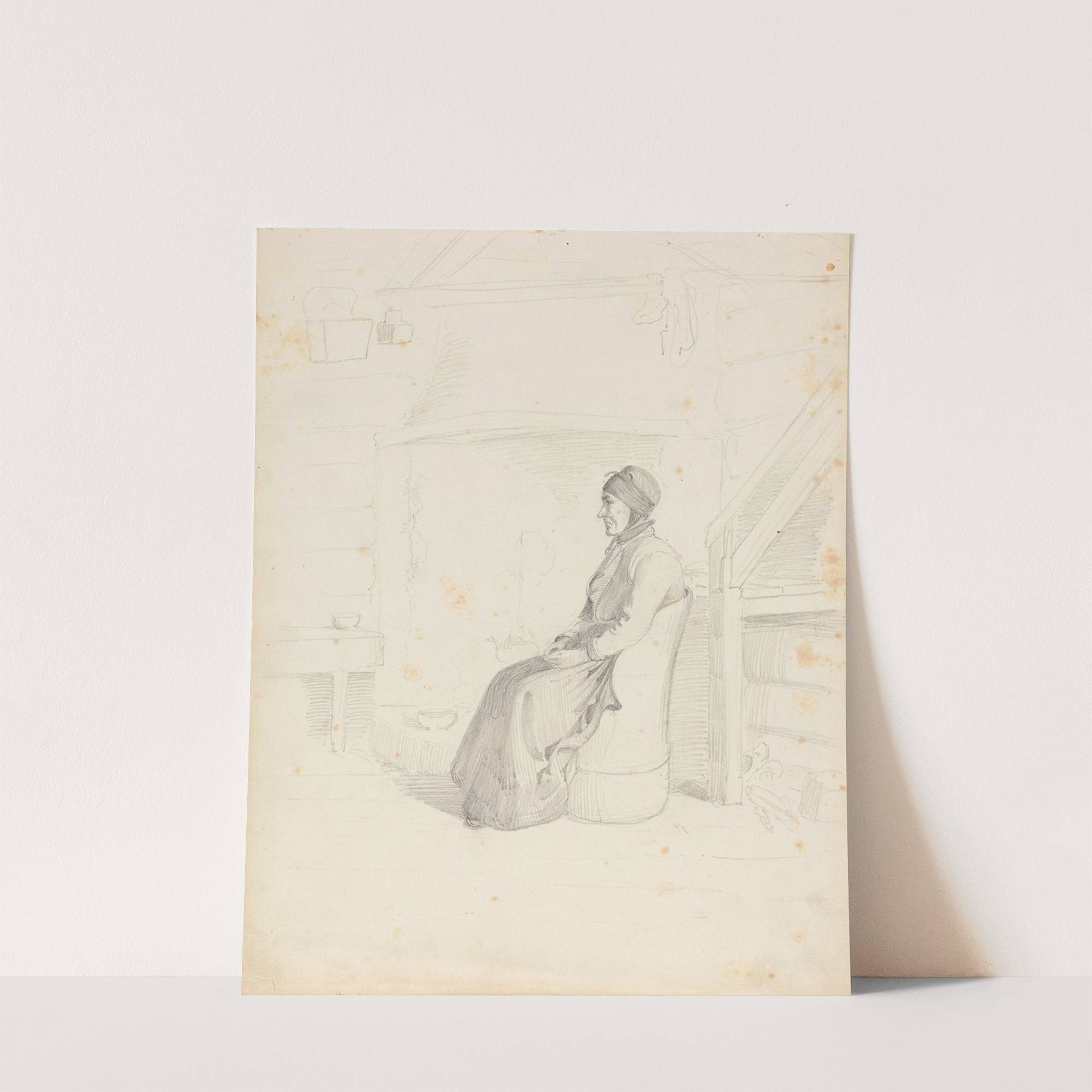 This elegant black-and-white sketch captures a quiet moment of reflection, featuring a woman seated in a simple chair against an indistinct background. She is depicted with delicate pencil lines that emphasize her serene posture and contemplative expression. The woman is...